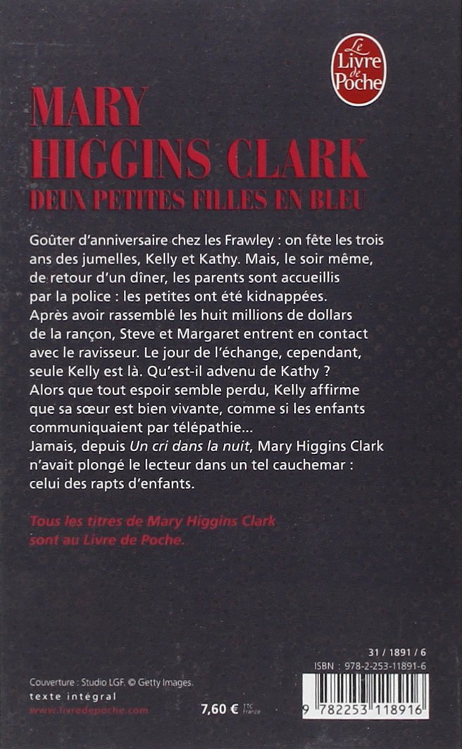 Goûter d'anniversaire chez les Frawley : on fête les trois ans des jumelles, Kelly et Kathy. Mais, le soir même, de retour d'un dîner, les parents sont accueillis par la police : les petites ont été kidnappées. Après avoir rassemblé les huit millions de dollars de la rançon, Steve et Margaret entrent en contact avec le ravisseur. Le jour de l'échange, cependant, seule Kelly est là. Qu'est-il advenu de Kathy ? Alors que tout espoir semble perdu, Kelly affirme que sa soeur est bien vivante, comme si les enfants communiquaient par télépathie... Jamais, depuis Un cri dans la nuit, Mary Higgins Clark n'avait plongé le lecteur dans un tel cauchemar : celui des rapts d'enfants.