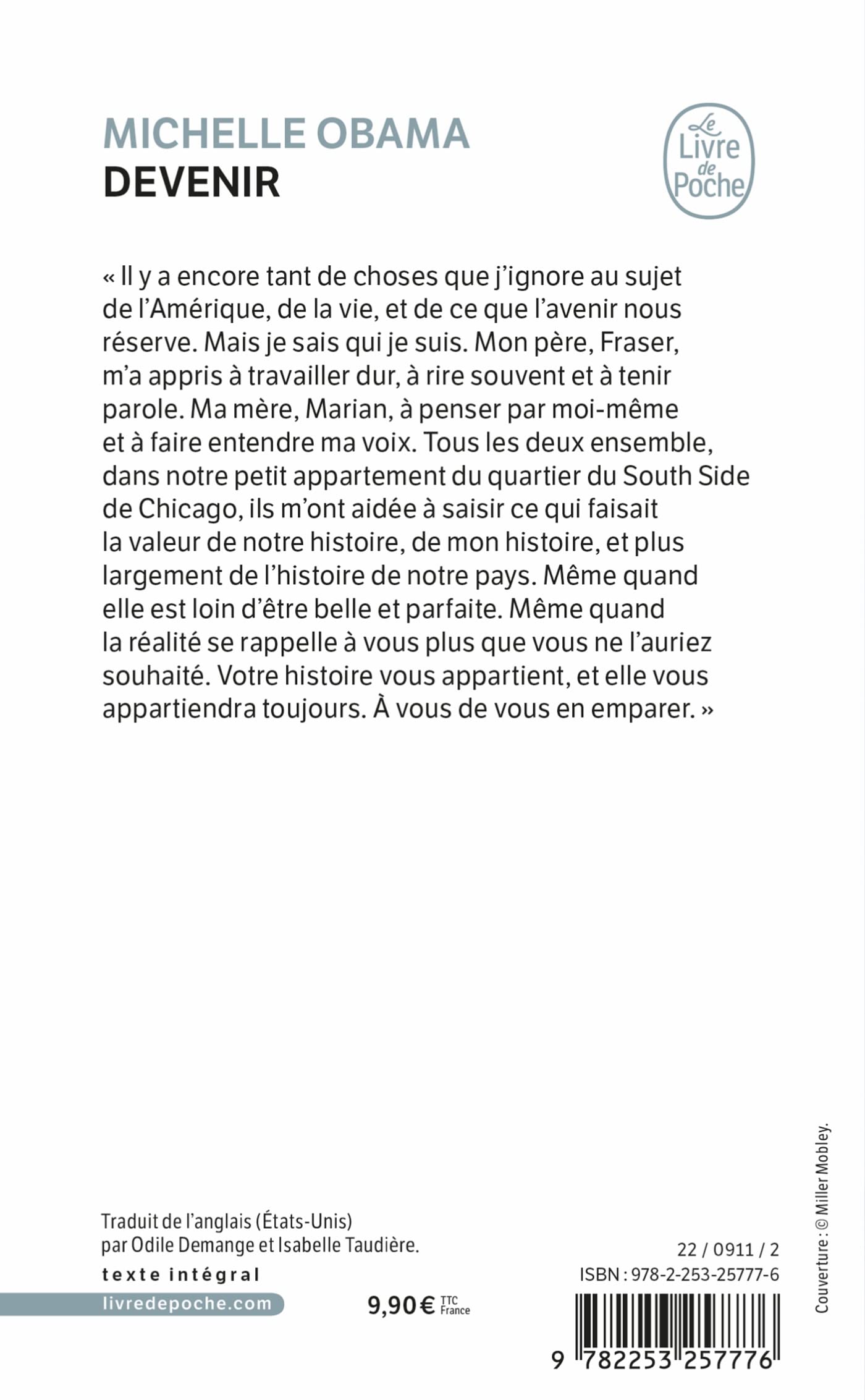 « Il y a encore tant de choses que j'ignore au sujet de l'Amérique, de la vie, et de ce que l'avenir nous réserve. Mais je sais qui je suis. Mon père, Fraser, m'a appris à travailler dur, à rire souvent et à tenir parole. Ma mère, Marian, à penser par moi-même et à faire entendre ma voix. Tous les deux ensemble, dans notre petit appartement du quartier du South Side de Chicago, ils m'ont aidée à saisir ce qui faisait la valeur de notre histoire, de mon histoire, et plus largement de l'histoire de notre pays. Même quand elle est loin d'être belle et parfaite. Même quand la réalité se rappelle à vous plus que vous ne l'auriez souhaité. Votre histoire vous appartient, et elle vous appartiendra toujours. À vous de vous en emparer. »