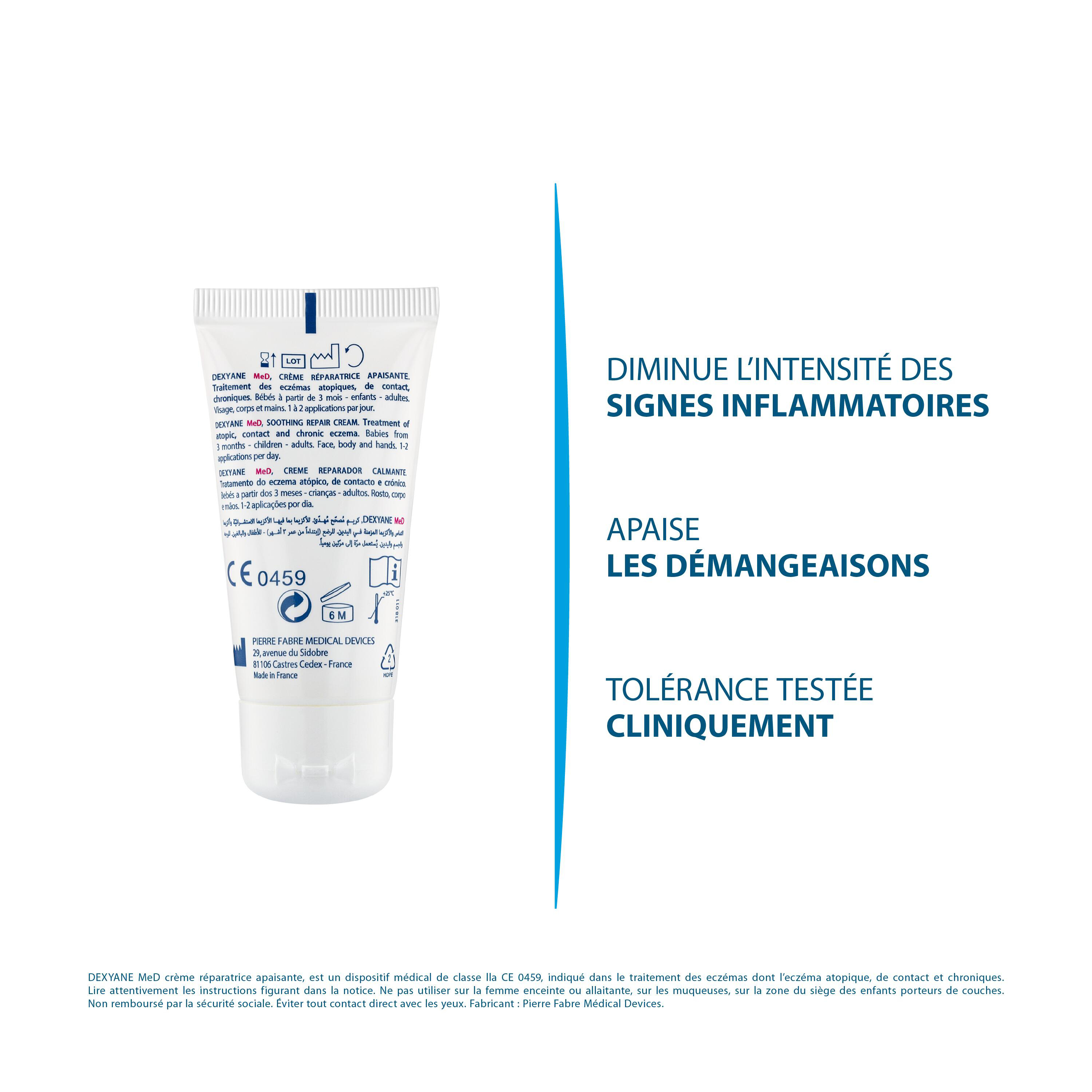 • La crème réparatrice apaisante DEXYANE MeD est un dispositif médical* qui traite et favorise la disparition des lésions d’eczéma atopique, de contact ou chronique et limite leur réapparition • Elle apaise les démangeaisons et diminue l’intensité des signes inflammatoires d’eczéma localisés sur le corps, le visage ou les mains • Peut être utilisé seul, en association ou en relais des dermocorticoïdes *DEXYANE MED crème réparatrice apaisante, est un dispositif médical de classe CE. Lire attentivement les instructions figurant dans la notice. Ne pas utiliser sur la femme enceinte ou allaitante, sur les muqueuses, sur la zone du siège des enfants porteurs de couches. Éviter tout contact direct avec les yeux. À partir de 3 mois. Fabricant : Pierre Fabre Médical Devices.
