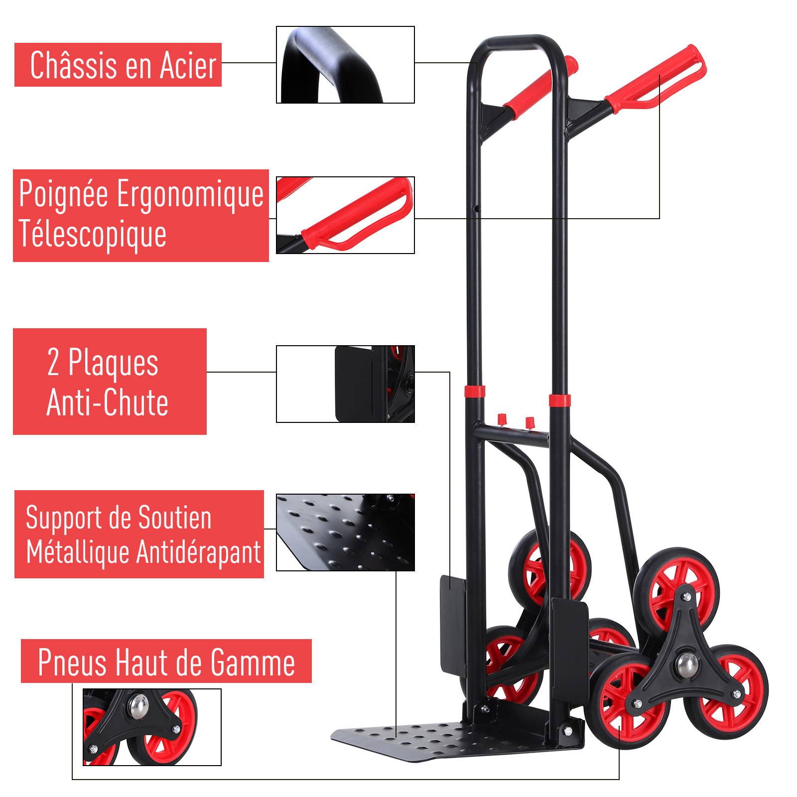 Diable pour escalier 6 roues diable repliable extensible 150 Kg - chariot pliable acier noir rouge