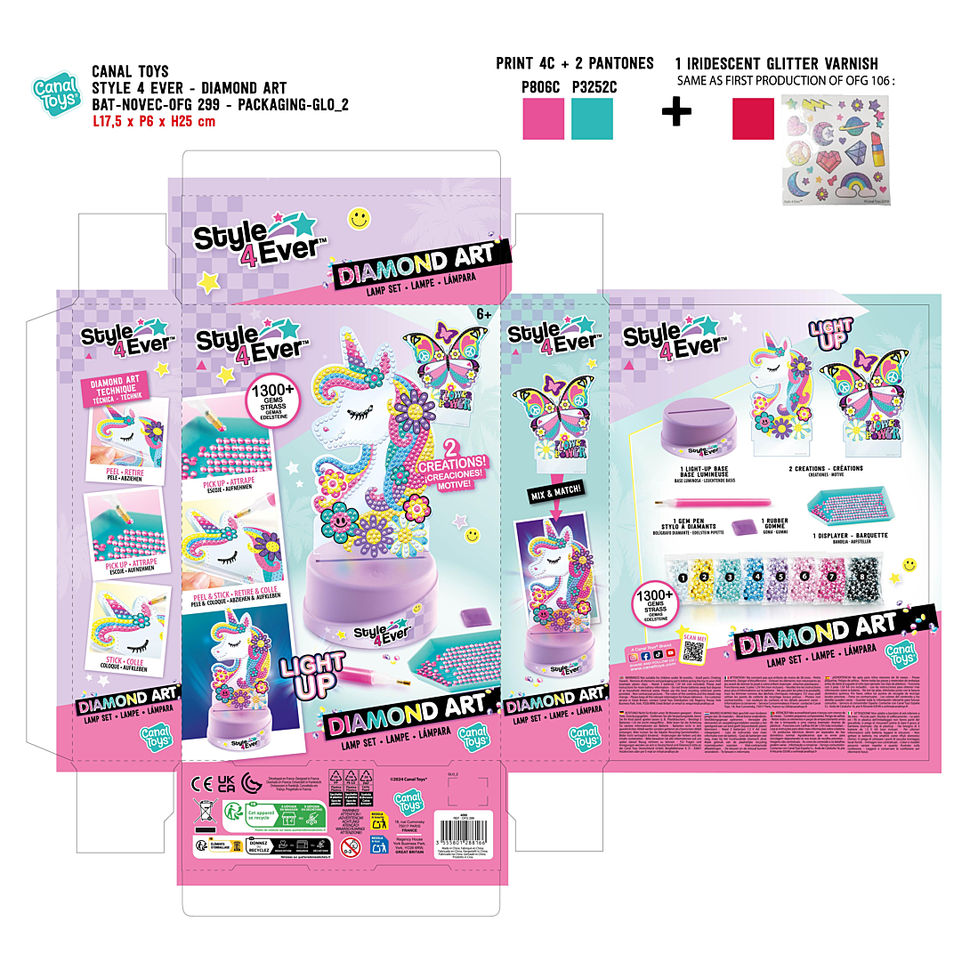 Un coffret avec 2 figurines à décorer selon la technique de la peinture diamant. Choisis ta figurine, et applique les strass un par un en suivant le modèle. Une fois terminée, place-la sur la base lumineuse pour qu'elle brille dans le noir !