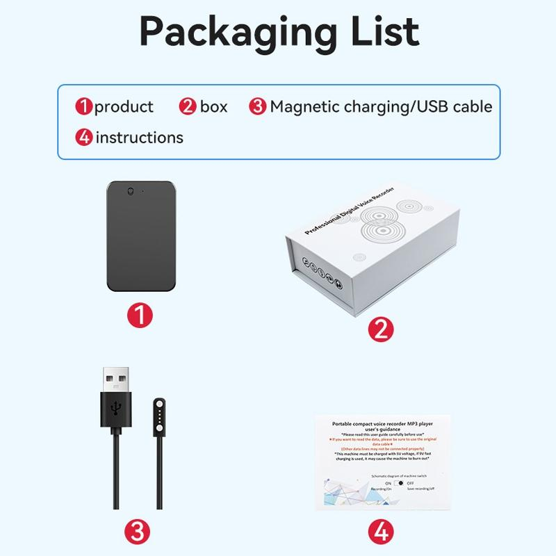 Chaque achat comprend un câble de charge magnétique et un manual d'instructions. Le dictaphone, pesant seulement 31g, est facile à transporter partout où vous allez.
