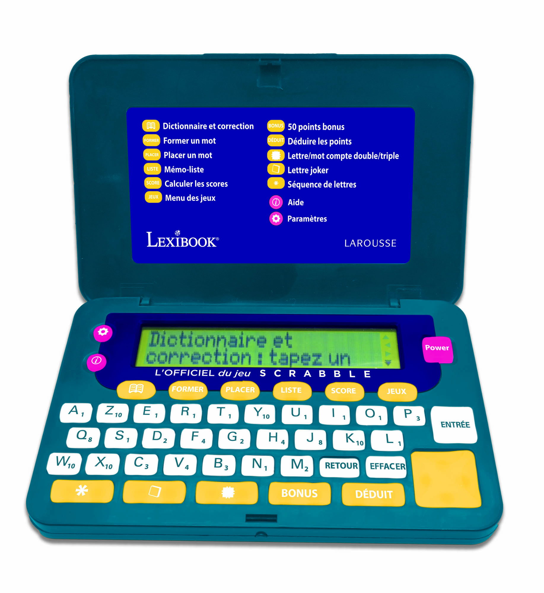 - Une nouvelle édition plus ergonomique avec de larges touches, écran agrandi de 10% et une molette de direction pour un confort d'utilisation optimal. - Accédez à une base répertoriant tous les mots admis au Scrabble, conformément à la 8e édition. - Élargissez vos possibilités de jeu grâce aux nombreux régionalismes et mots de la francophonie (Afrique, Belgique, Canada/Québec, Luxembourg, Suisse), ainsi qu’aux définitions concises de mots difficiles, peu courants ou spécialisés. - Optimisez votre jeu en formant et plaçant vos mots à l’aide des touches spécialement prévues à cet effet : « FORMER » et « PLACER ». Soyez sûrs des mots joués en vérifiant leur orthographe grâce à la correction orthographique et phonétique. - Maximisez vos scores grâce au respect des valeurs faciales et à la saisie possible des cases multiplicatrices. - Détendez-vous avec nos 4 autres jeux de lettres : Génie du Scrabble, Pendu, Méli-Mélo et Mot Mystère