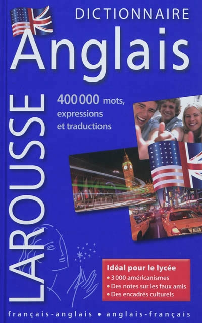 Larousse Dictionnaire Anglais français - anglais ¤ anglais - français Idéal pour l'étude de l'anglais au lycée Tout le vocabulaire courant et actuel . 400 000 mots, expressions et traductions . Plus de 3 000 américanismes . Tous les niveaux de langue . Les abréviations et sigles les plus usuels Tout pour faciliter l'apprentissage . Des milliers d'exemples pour illustrer les différents sens des mots . Des notes d'usage (faux amis, mots à ne pas confondre, etc.) . Des encadrés sur des constructions lexicales ou grammaticales . Les expressions les plus courantes . Plus de 300 notes culturelles sur la civilisation anglo-saxonne Avec un guide de communication . Plus de 100 modèles de lettres et d'e-mails