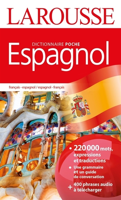 Dictionnaire poche Espagnol Ultra pratique, actuel et complet ! Pour enrichir son vocabulaire . 220 000 mots, expressions et traductions . Le vocabulaire le plus récent . De très nombreux exemples . Plus de 2 000 latino-américanismes Pour progresser . Du vocabulaire thématique . Des rappels de grammaire . Les expressions les plus courantes . Des informations culturelles + Une grammaire détaillée + Un guide de conversation + 400 phrases à télécharger sur www.editions-larousse.fr/poche-espagnol