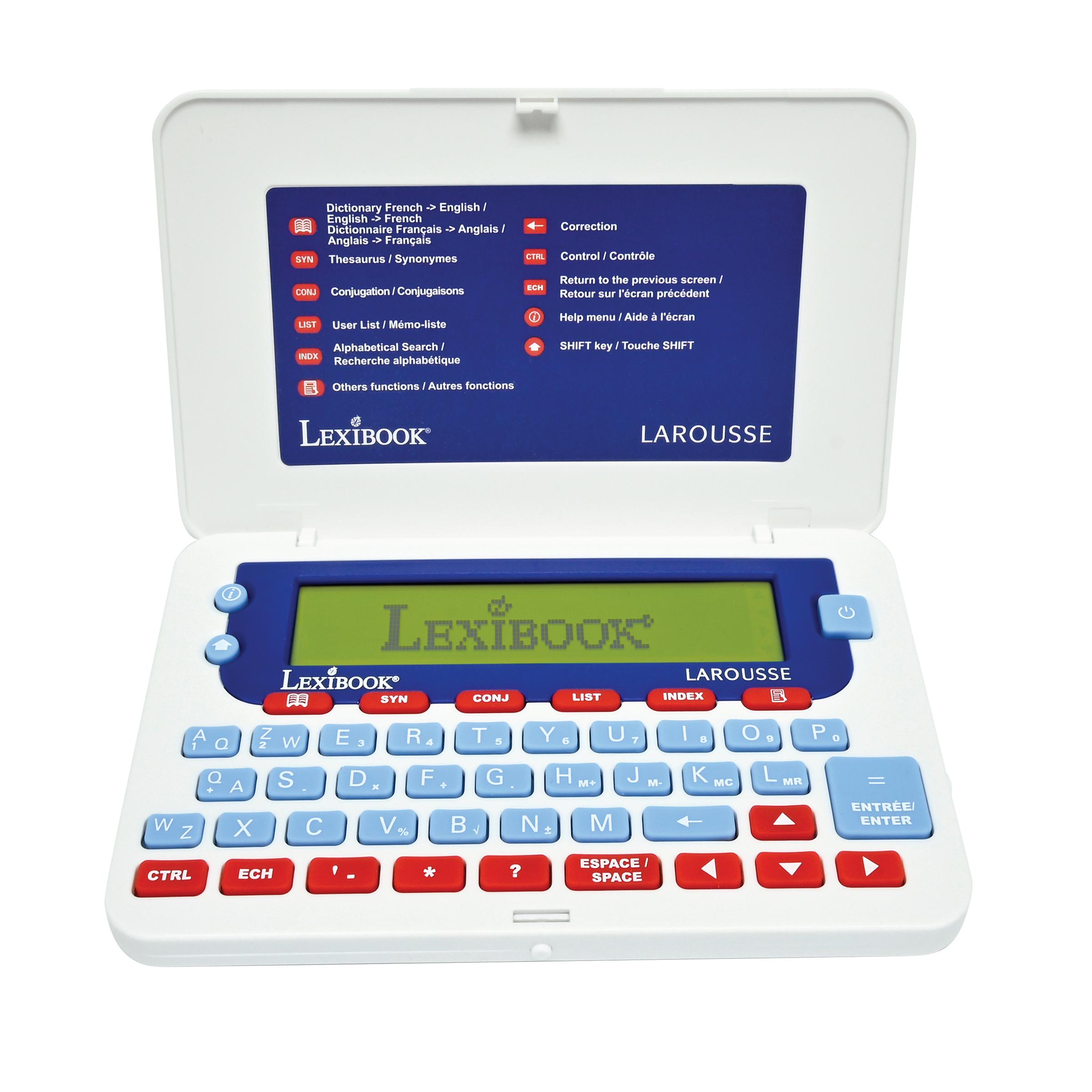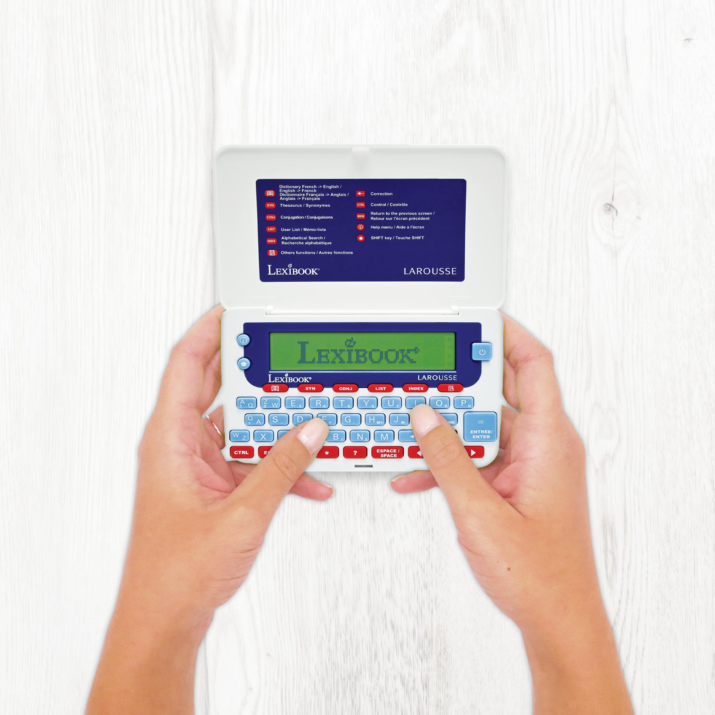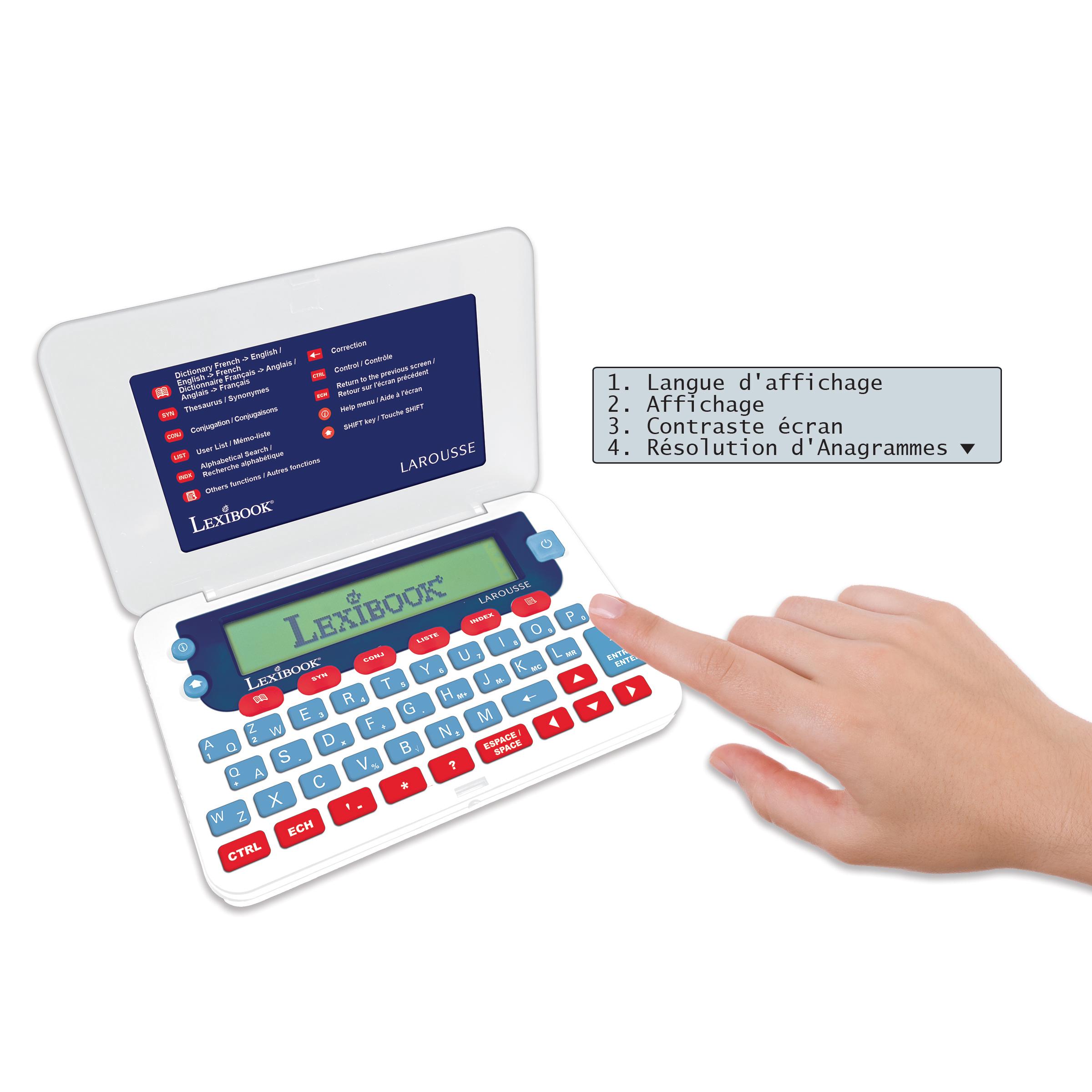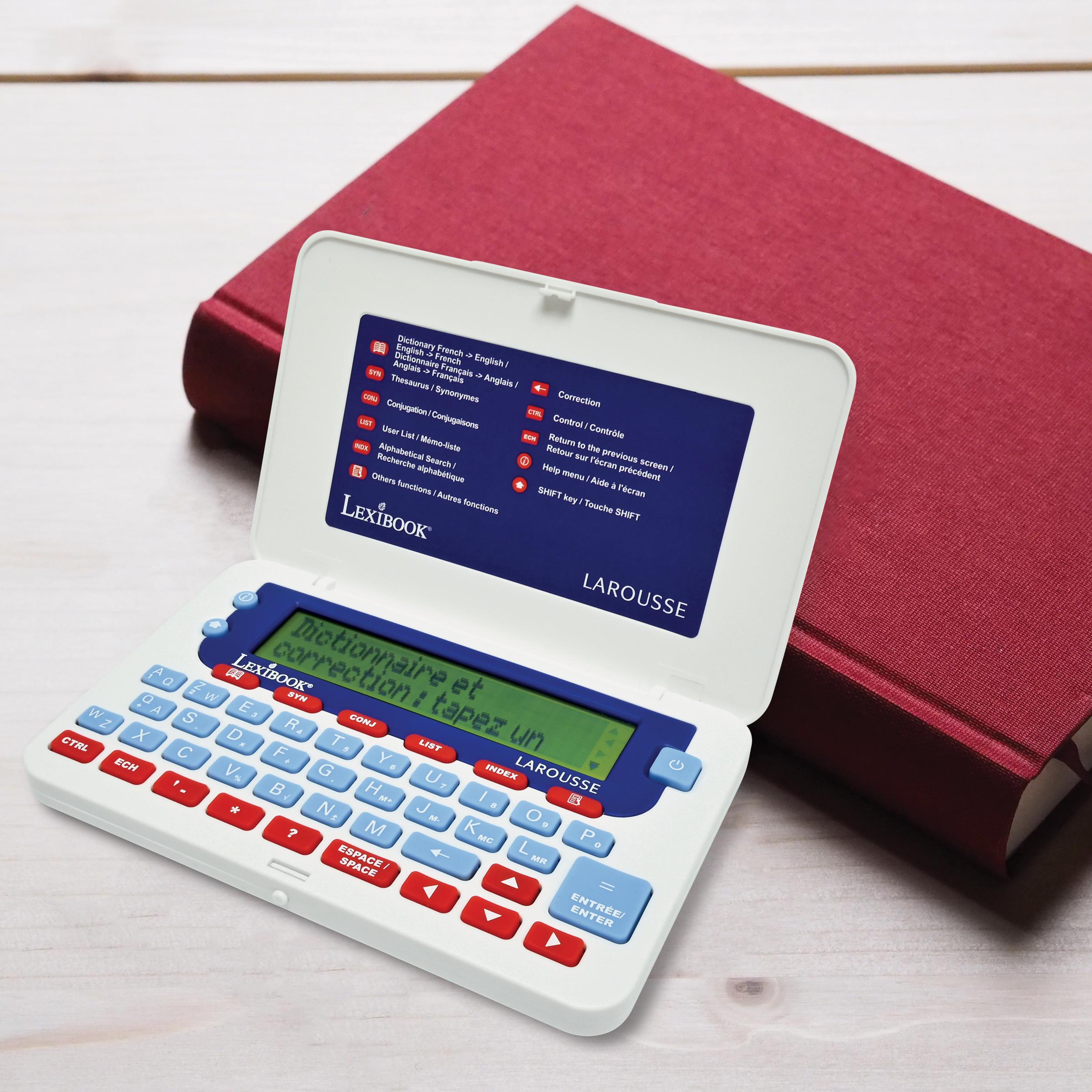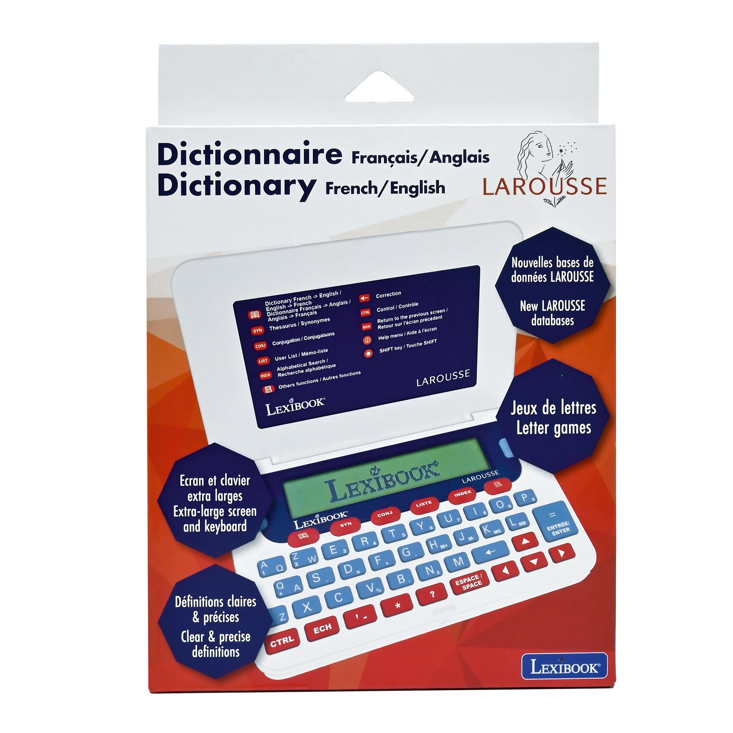 * D�finition compl�te de tous les mots du dictionnaire, jusqu'� 6 d�finitions par mot. * 77 000 d�finitions - 200 000 synonymes - 9 000 verbes conjugu�s * Autres fonctions : r�solution de mots crois�s, correcteur d'orthographe, dictionnaire des synonymes et des contraires & conjugaison. * 3 jeux : jeu du pendu, jeu du m�li-m�lo & R�solution d'anagrammes. * Avec le dictionnaire �lectronique LAROUSSE, laissez-vous guider pour une ma�trise parfaite de la langue fran�aise. * Grand �cran de 3 lignes pour une lecture facile et des boutons larges pour une utilisation simple. * Fonction loupe pour une meilleure lisibilit�. * Autres utilisations : calculatrice, convertisseurs de m�trique et devises, "M�mo-liste", horloge et date. * Aide � l'�cran � tout moment.