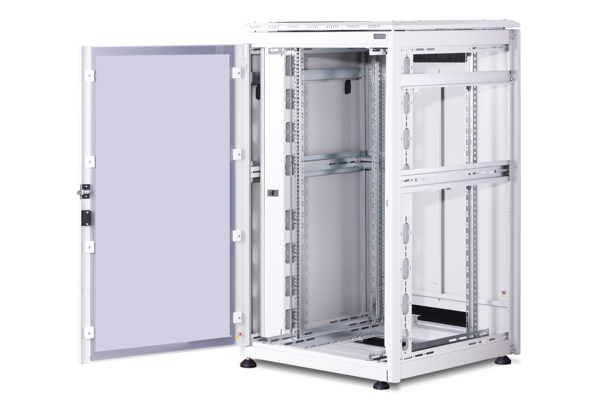 Les armoires réseau de la série Unique ont été conçues et produites pour un câblage réseau particulièrement confortable et flexible. Des optimisations bien pensées offrent une stabilité conforme au marché et une flexibilité maximale. Un châssis de fond modulaire, ouvrable grâce à des plaques aveugles vissées de 483 mm (19"), offre suffisamment de place pour tous les types de câbles. En outre, des entrées de câbles latérales avec brosse se trouvent en haut et en bas de l'armoire, ainsi qu'une autre à l'arrière du châssis inférieur. Des barrettes à brosses situées au-dessus et en dessous de la porte arrière (à partir de 26U) permettent une utilisation dans les scénarios d'application les plus divers. De grands chemins de câbles verticaux avec guide-câbles et cache, installés à l'avant (à partir d'une largeur d'armoire de 800 mm), complètent parfaitement les nombreuses caractéristiques de l'armoire réseau. Deux paires de rails profilés de 483 mm (19"), coudés et galvanisés, marqués avec des unités de hauteur lisibles en sens inverse, sont montées à l'intérieur. Ils sont réglables en continu et sont reliés à des traverses de profondeur supplémentaires dans l'armoire. Chaque armoire est une construction robuste en acier d'une épaisseur maximale de 1,5 mm. La peinture est réalisée sous forme de revêtement par poudre électrostatique dans les couleurs standard gris (RAL 7035) et noir (RAL 9005). Les parois latérales et les portes modulaires verrouillables et amovibles améliorent l'accessibilité. Il est possible de changer le sens des portes. En outre, les armoires sont entièrement démontables en cas de besoin grâce à leur construction démontable. En tenant compte de facteurs tels que le poids et le développement de chaleur des composants encastrés, toutes les armoires réseau DIGITUS® Unique peuvent également être utilisées comme armoires de serveurs, selon l'application. Dans ce cas, l'installation de portes en tôle d'acier perforée permet d'améliorer le refroidissement passif des composants installés. Un modèle défini par DIGITUS® comme une armoire de serveur est par exemple complété par des supports PDU à l'arrière dans la configuration standard de la série Unique Server-N. Les supports PDU peuvent être installés à l'arrière de l'armoire de serveur.
