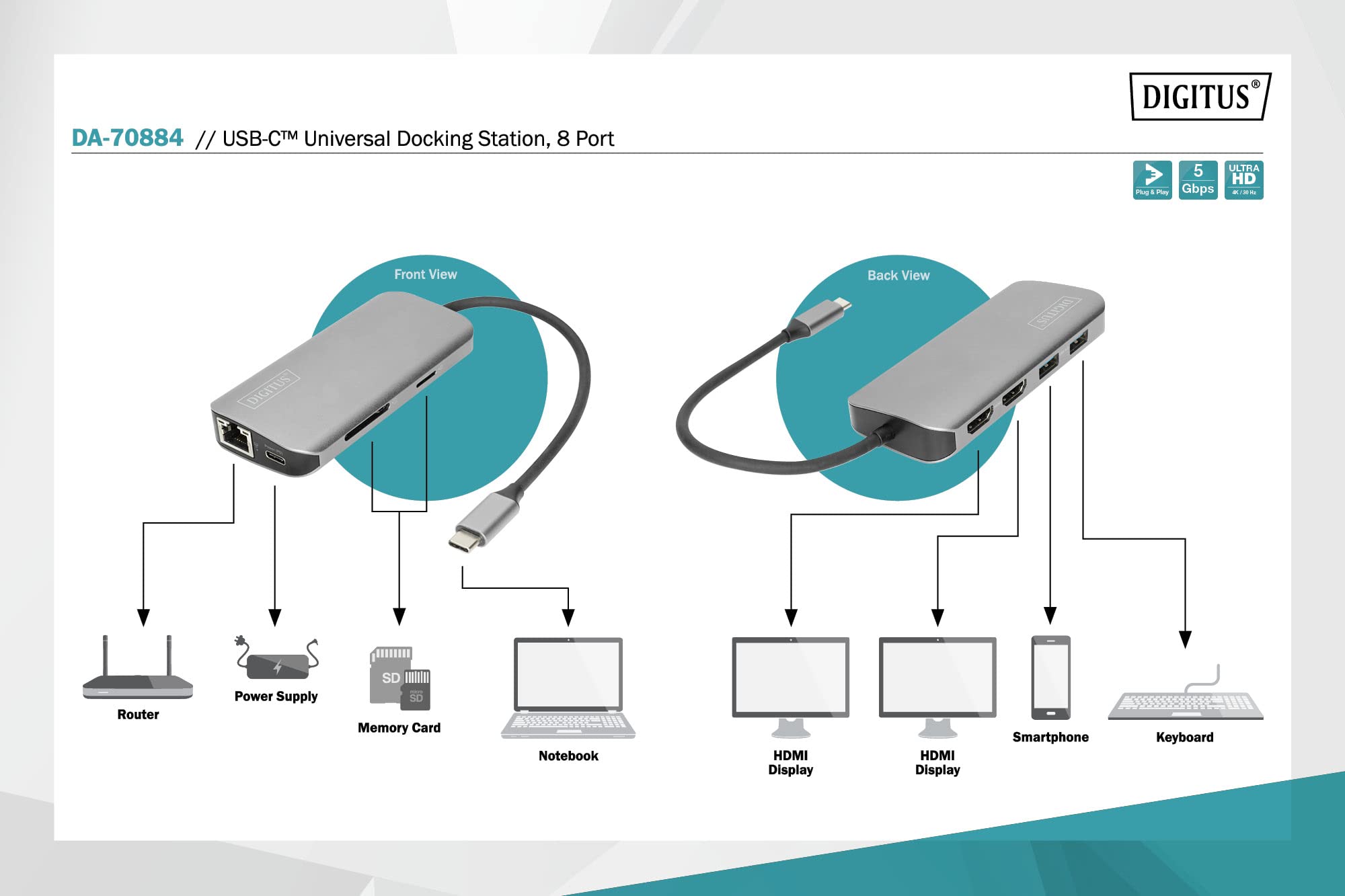 Complétez votre ordinateur portable avec 8 interfaces supplémentaires comme HDMI 4K, Gigabit Ethernet ou USB 3.0 — avec USB-C Power Delivery - 8 interfaces supplémentaires sur votre ordinateur portable/PC pour vidéo, données, puissance et Ethernet - 2 x ports HDMI UHD 4K / 60 Hz (fonction Dual-Display) - 2 x ports USB 3.0 (SuperSpeed, 5 Gbits/s) — pour une transmission de données rapide - 1 x port USB-C PD 3.0 (Power Delivery) pour charger rapidement votre ordinateur portable - 2 x lecteurs de cartes (SD/MicroSD, jusqu'à 2 To - 1 x interface Gigabit Ethernet RJ45 — connexion de l'ordinateur portable à Internet/LAN - Affichage étendu ou affichage miroir possible (extension/miroir) sur Windows - Prise en charge des modes SST et MST - Boîtier en aluminium brossé de haute qualité - Longueur du câble : 20 cm La station d'accueil USB-C de DIGITUS® complète votre ordinateur portable avec 8 interfaces supplémentaires. Intègre notamment 2 interfaces HDMI avec des résolutions pouvant atteindre 4K / 30 Hz et une résolution Full HD 1080 p / 60 Hz supportée en connectant 2 écrans simultanément. Pendant l'utilisation de la station d'accueil, vous pouvez charger l'ordinateur portable connecté via le port USB-C Power Delivery disponible. La capacité de charge maximale est de 100 W. Il y a également 2 ports USB 3.0, auxquels vous pouvez connecter les périphériques correspondants tels qu'un clavier, une souris ou un disque dur externe / une clé USB. De plus, la fonction Battery Charge (BC 1.2) permet de recharger des appareils tels que les smartphones ou les tablettes. La connexion Gigabit RJ45 existante peut être connectée à votre routeur et donc à l'Internet, auquel vous pouvez alors accéder via l'ordinateur portable connecté. Deux fentes pour les cartes SD et Micro SD complètent la station d'accueil et prennent en charge les cartes mémoire jusqu'à 2 To. Le boîtier compact en aluminium brossé est élégant et facile à transporter en voyage. Aucune installation de pilote n'est nécessaire grâce à la fonction Plug and Play, de sorte que la station d'accueil peut également être rapidement connectée à des systèmes tiers.