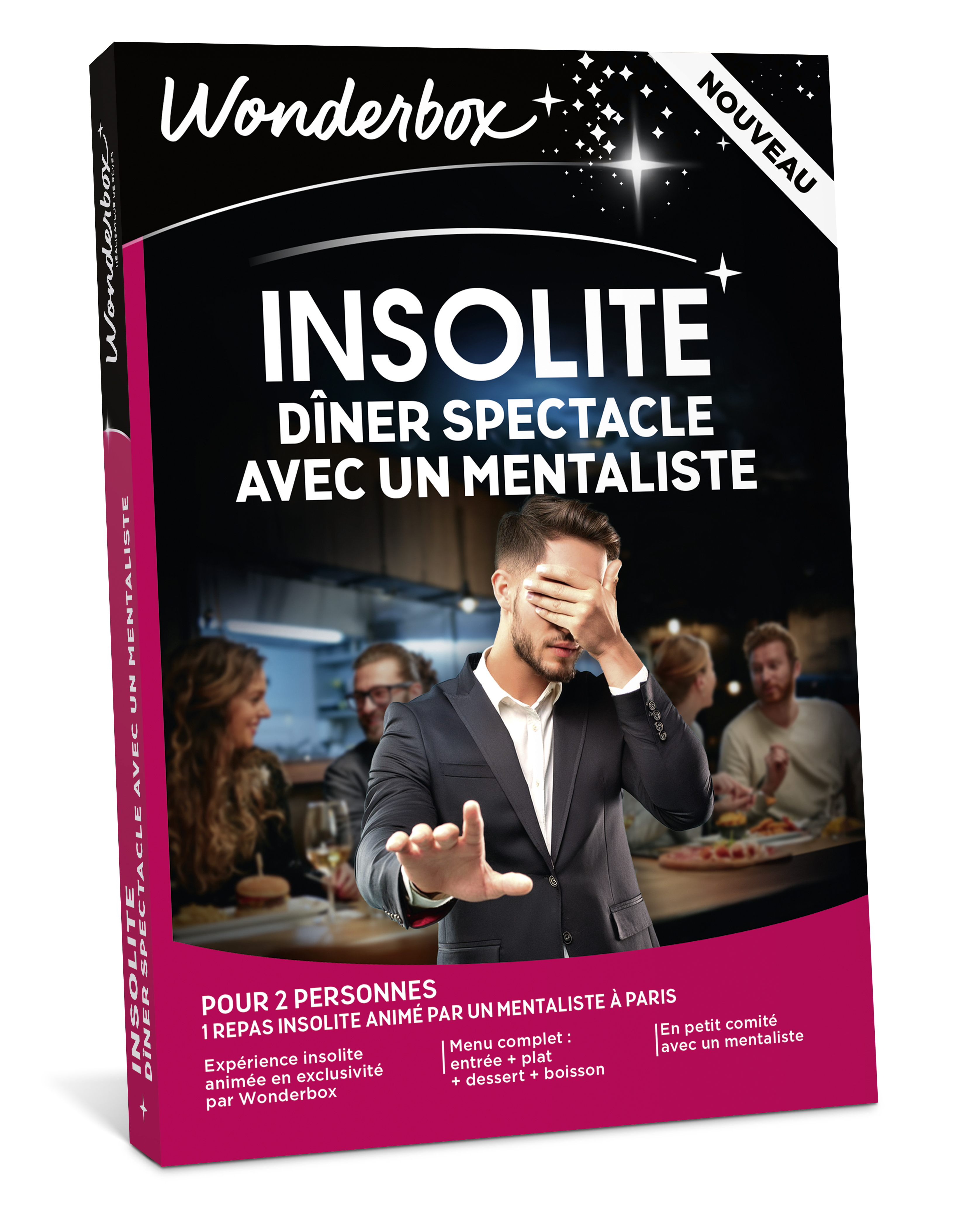 1 repas insolite avec un mentaliste à Paris pour 2 personnes. Menu complet : entrée à partager + plat + dessert + boisson. Expérience insolite animée en exclusivité par Wonderbox Envie de sortir de votre quotidien et de vivre une expérience gustative originale en duo chez notre partenaire Parisien ? Avec ce coffret, découvrez l’univers du mentalisme avec un véritable maître en la matière. Faites place au spectacle le temps d’un savoureux dîner et entrez dans un monde où tout n’est que magie, mystère et illusion ! Cette expérience gourmande et insolite organisée en exclusivité par Wonderbox vous laissera des souvenirs indélébiles !