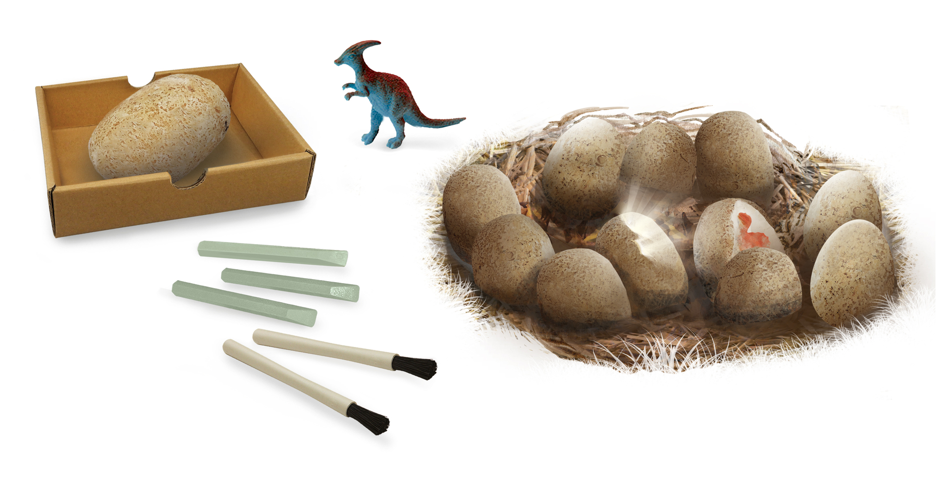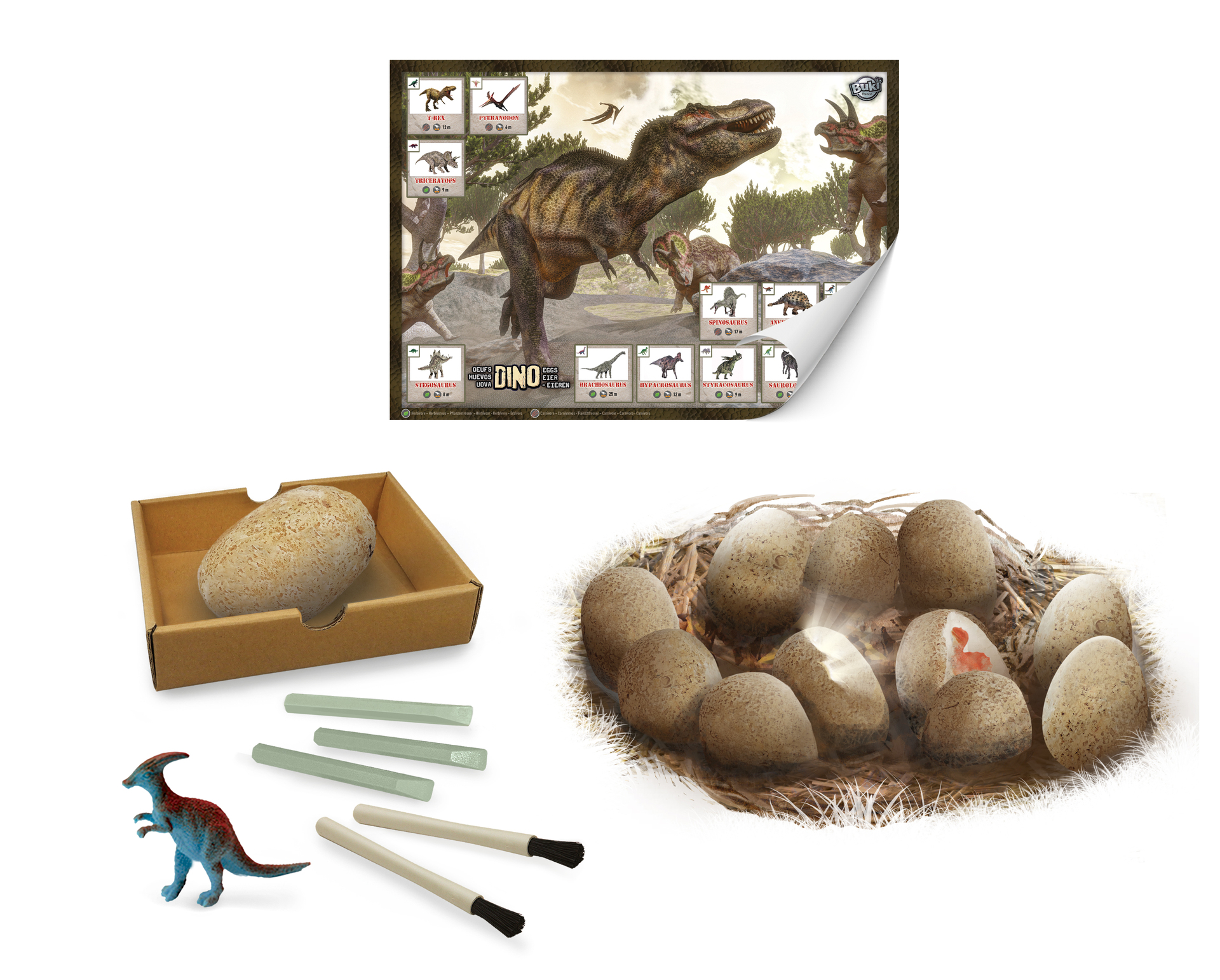 Un coffret avec 12 œufs à creuser pour déterrer 12 dinosaures différents dont le T-Rex, le Brachiosaure, le Tricératops, le Ptéranodon ou le Spinosaure… Décore ta chambre avec le poster. Inclus : les outils de fouille et un plateau pour creuser sans salir. Dès 6 ans