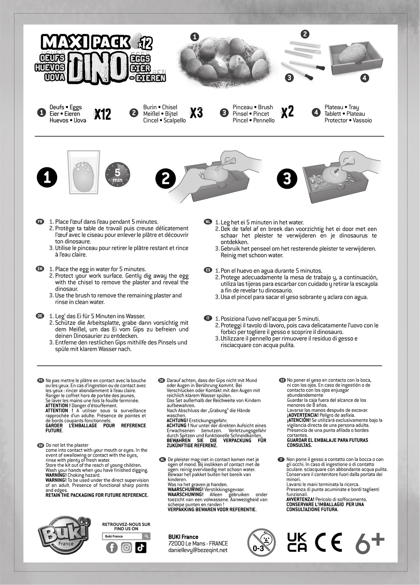 | Avertissements | Mise en garde : uniquement pour enfants de 6 ans et plus. Attention ! Ne convient pas aux enfants de moins de 36 mois ; danger d'étouffement ; présence de petits éléments susceptibles d'être ingérés. Attention ! À utiliser sous la surveillance rapprochée d'un adulte ; présence de pointes et de bords coupants fonctionnels. Ne pas mettre le plâtre en contact avec la bouche ou les yeux ; en cas d'ingestion ou de contact avec les yeux : rincer abondamment à l'eau claire. Ranger le coffret hors de portée des enfants de moins de 6 ans. Se laver les mains une fois la fouille terminée. |
