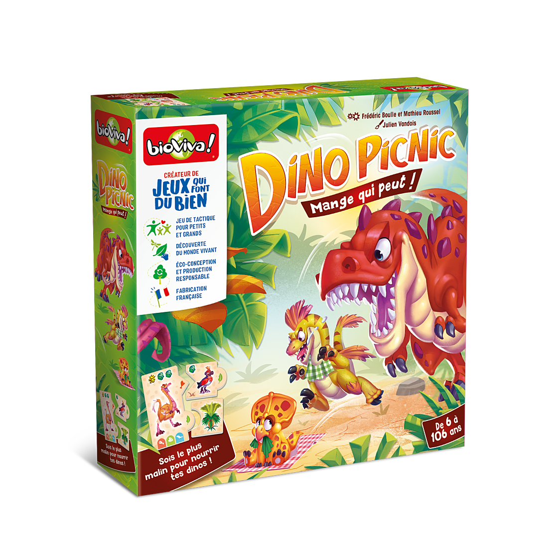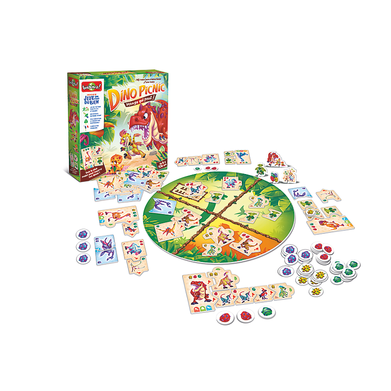 La boîte contient 72 tuiles Dinosaure, 4 tuiles Majorité, 48 jetons OEuf en bois, 1 dino en bois 1 er joueur, 1 grand plateau rond, 1 livret de règles du jeu avec partie pédagogique