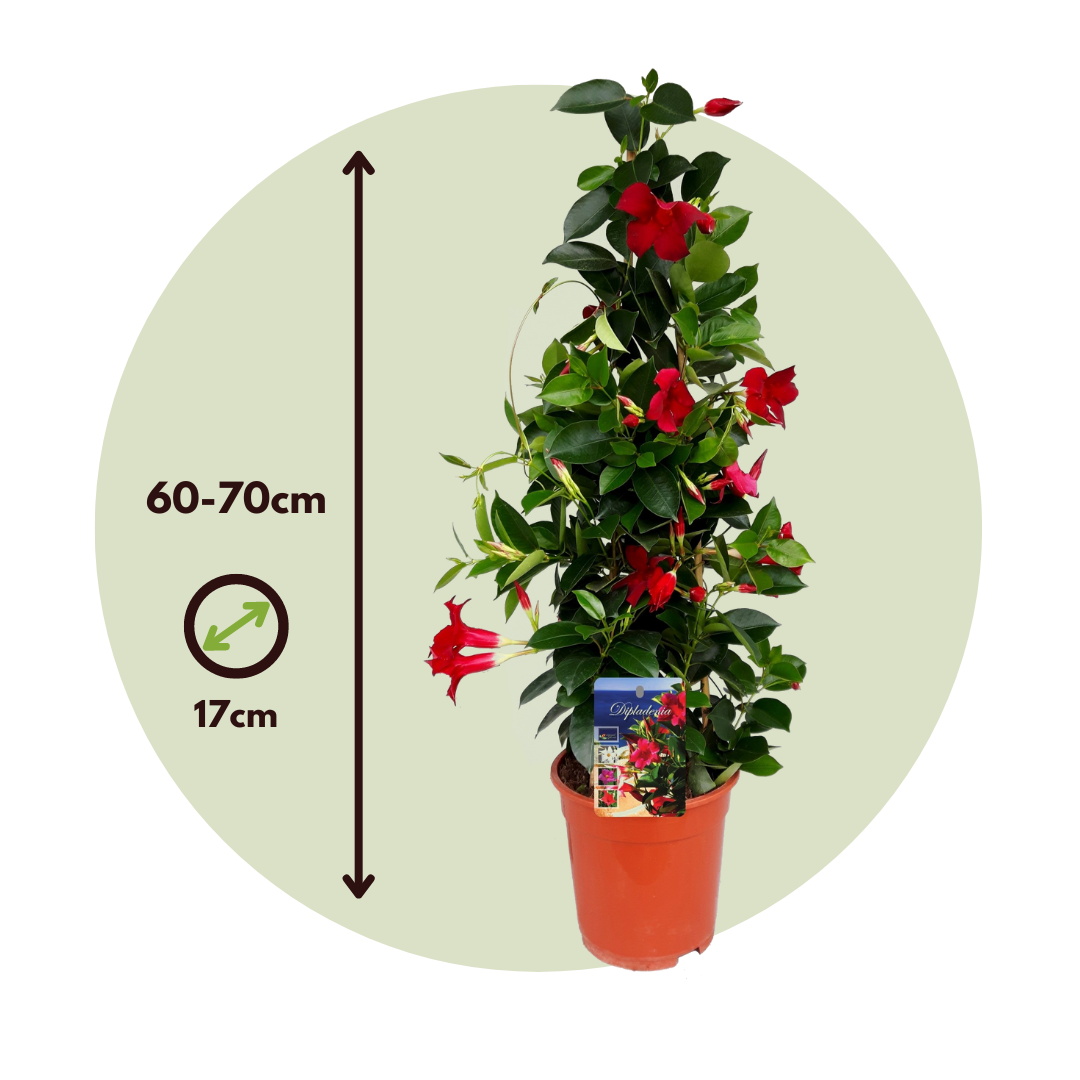 La Mandevilla, également connue sous le nom de Dipladenia, est l'une des plantes de jardin à fleurs les plus gratifiantes. De mai jusqu'aux premières gelées, cette plante vous surprendra avec ses fleurs en forme de trompette d'un rouge profond. C'est pourquoi la Mandevilla est une plante fleurie très populaire dans les jardins, sur les balcons ou les terrasses. C'est une plante grimpante qui fleurit de mai à octobre (ou parfois même jusqu'en novembre ou début décembre !). Cette plante exotique est originaire d'Amérique du Sud, mais elle est également très populaire dans notre jardin. La plante a une très longue durée de floraison et ses fleurs répandent un délicieux parfum. En tant que plante à croissance luxuriante, elle produit également de très longues vrilles en peu de temps, de sorte qu'elle peut facilement couvrir un mur ou une clôture. Ce Mandevilla pousse contre des bâtons de bambou, ce qui donne à la plante une forme pyramidale saisissante.