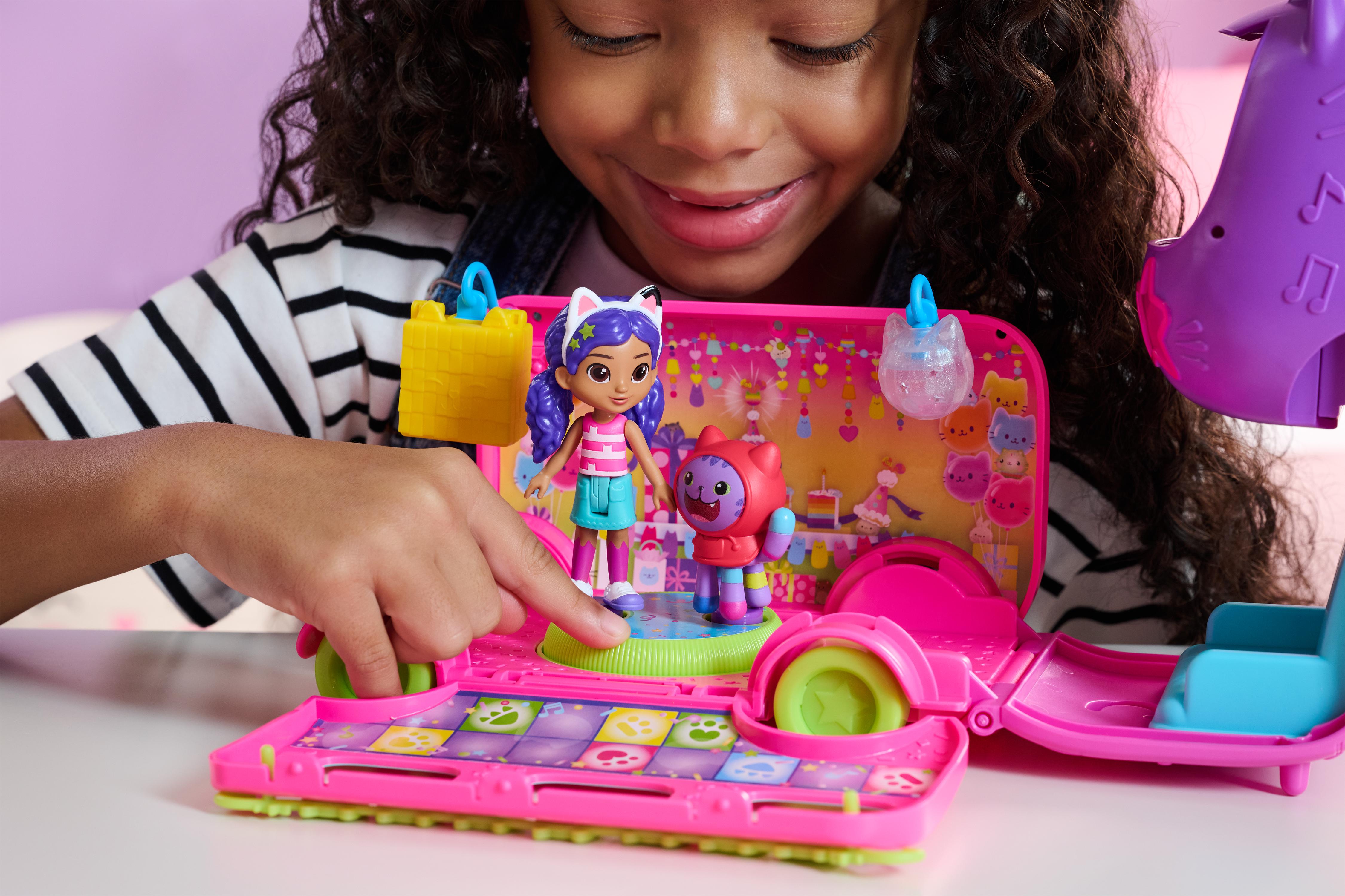 Tous à bord du disco bus formiaoudable avec Gabby et ses amis les chats ! Ce magnifique bus s'ouvre pour se transformer en véritable univers de jeu pour faire la fête avec plusieurs scènes : - 1 piste de danse pivotante - 1 salle de repos - 1 salle de musique pour le DJ Place les figurines dans la cabine pour les emmener vers de nouvelles aventures. Contient : 1 disco bus transformable, 2 figurines de Gabby et DJ Miaou et 8 accessoires dont 2 surprises. Une application gratuite à télécharger grâce au QR code inclus pour poursuivre l'expérience de jeu. Boîte ouverte. A partir de 3 ans.