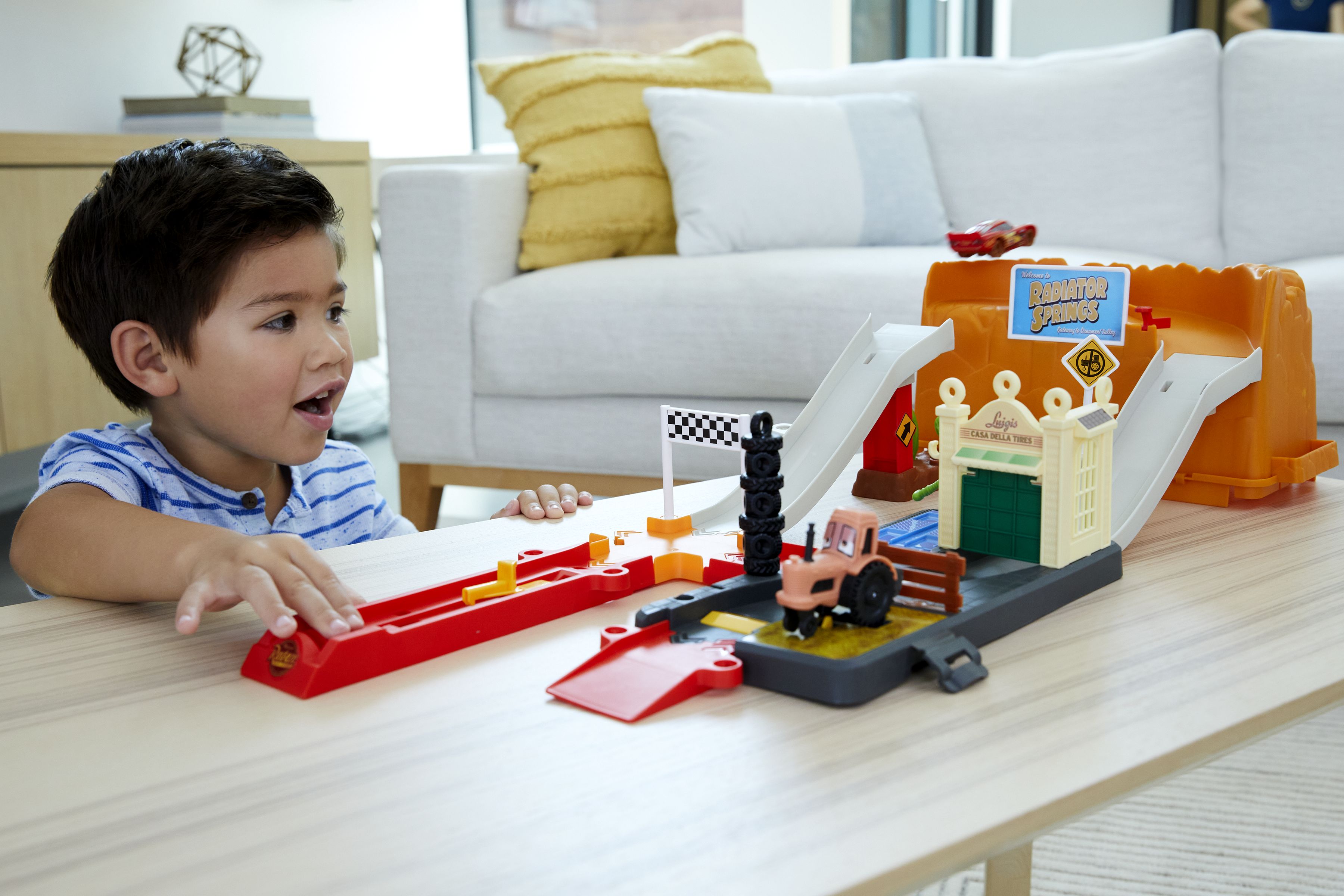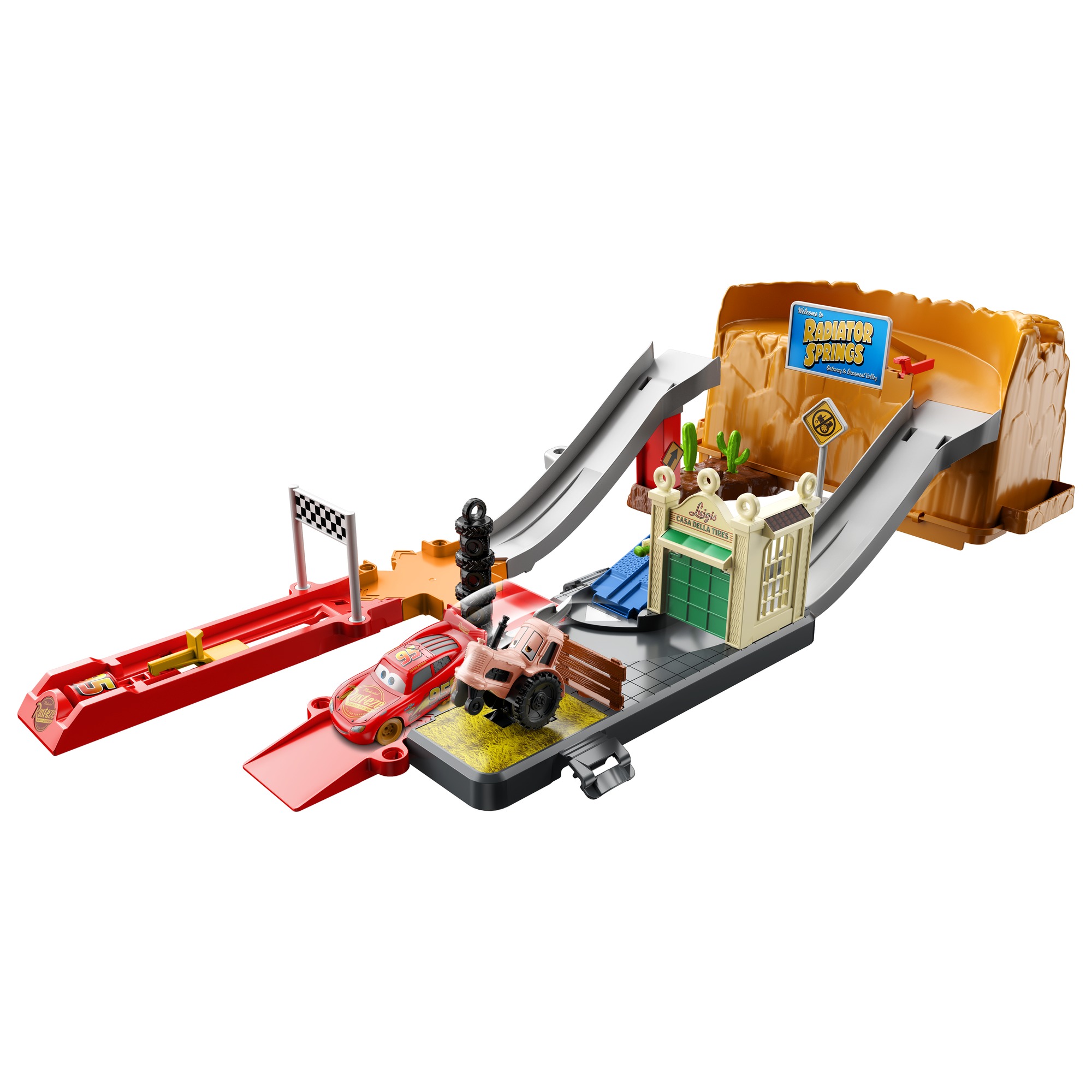 Le coffret Radiator Springs Cars de Disney-Pixar offre de nombreuses possibilités de jeu avec plus de 20 éléments, dont les véhicules Flash McQueen et Tracteur, ainsi qu’un bac de rangement pour emporter les personnages de Radiator Springs partout ! Les enfants peuvent créer différentes configurations avec le bac de rangement en forme de rocher et les différentes sections de piste, puis propulser les véhicules vers la ligne d’arrivée grâce au lanceur double en forme de bidon d’huile. Attention aux sauts, dérapages, barrières de déviation et animations activées par le passage des véhicules, comme le tracteur qui bascule. Via le « piège de vitesse », les enfants peuvent même propulser un deuxième personnage au cœur de l’action, comme Shérif (vendu séparément, certains produits peuvent ne pas être commercialisés). Les couleurs et les décorations peuvent varier.