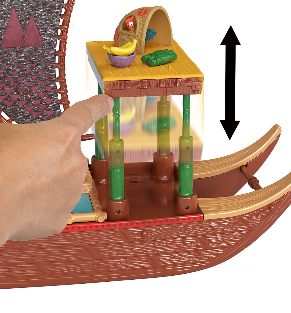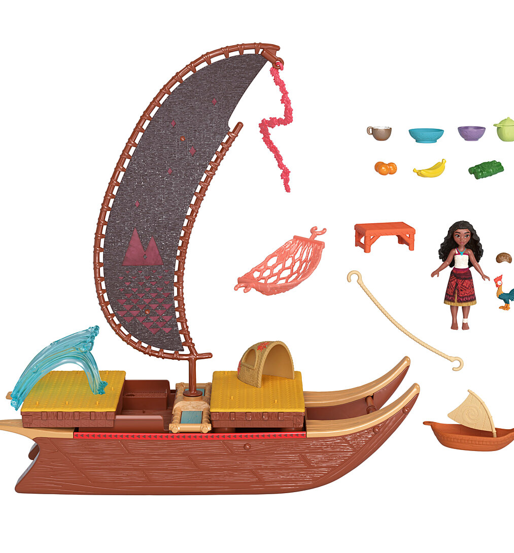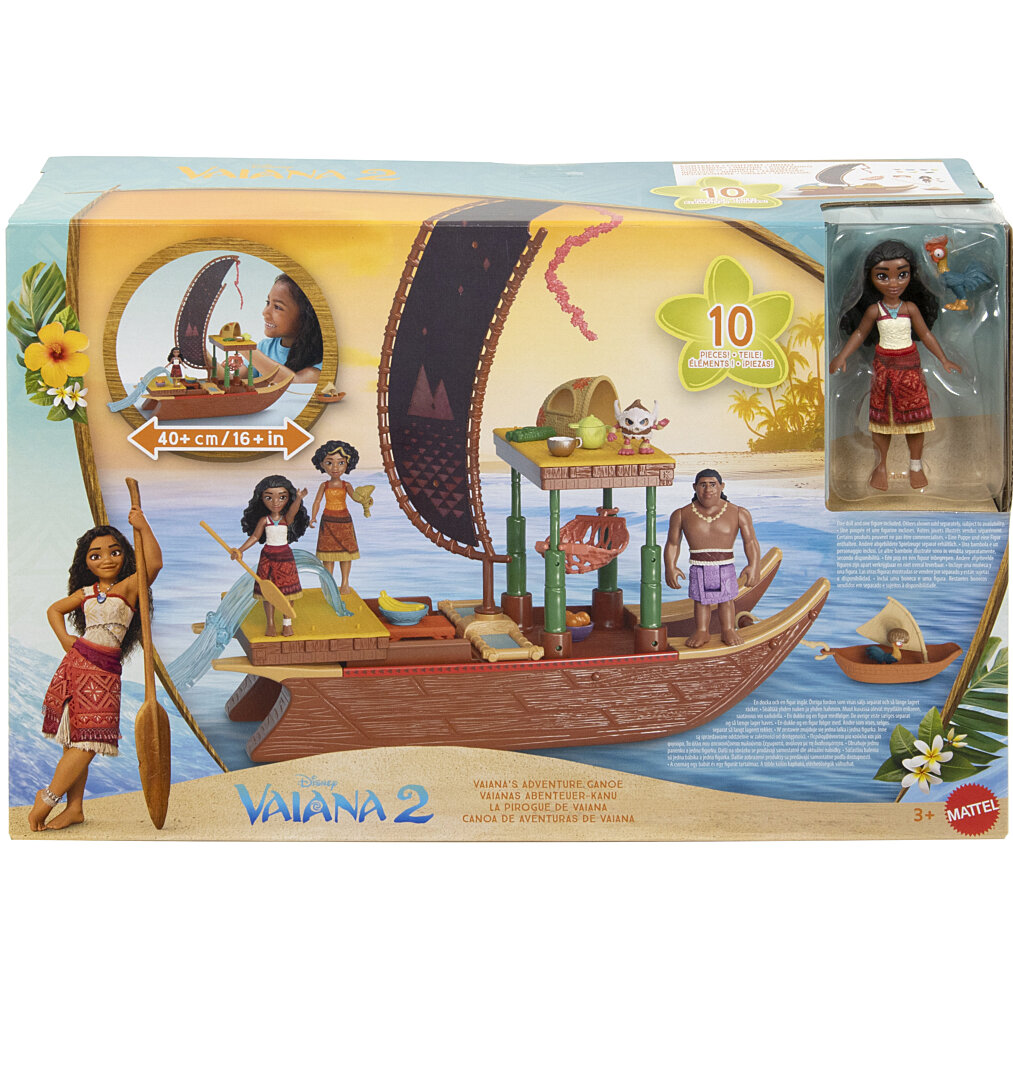 La boîte contient Contient une pirogue flottante, 1 petite poupée Vaiana, 1 animal et 10 accessoires.