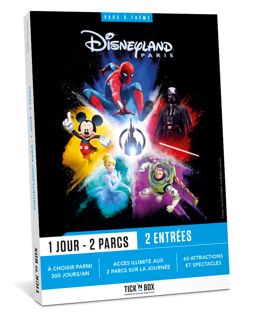 Avec Tickn'Box, découvrez la magie de Disneyland® Paris ! Retrouvez les histoires de votre enfance et celles d’aujourd’hui dans les 2 Parcs Disney®, avec plus de 50 attractions, des spectacles fascinants, des parades éblouissantes, des rencontres inoubliables avec les Personnages Disney® et des animations renouvelées au fil des saisons ! Avec Tickn'Box, plongez dans l'univers des plus beaux parcs à thèmes d'Europe. Dans votre Tickn'Box, vous découvrirez : Un chèque cadeau échangeable contre 2 entrées pour 1 journée/2 parcs valable 300 jours par an (période Mini et Magic). Ce chèque permet de réserver votre séjour en vous connectant sur le site tickandbox.net. Le coffret est valable pour 2 places, 24 mois à compter de sa date d’achat. Tickn'Box est revendeur officiel de Disneyland Paris. Choisissez votre journée et vivez une expérience unique. Votre séjour est totalement personnalisable lors de votre réservation en ligne (ajout d'entrées ou de journées supplémentaires au meilleur prix du moment).