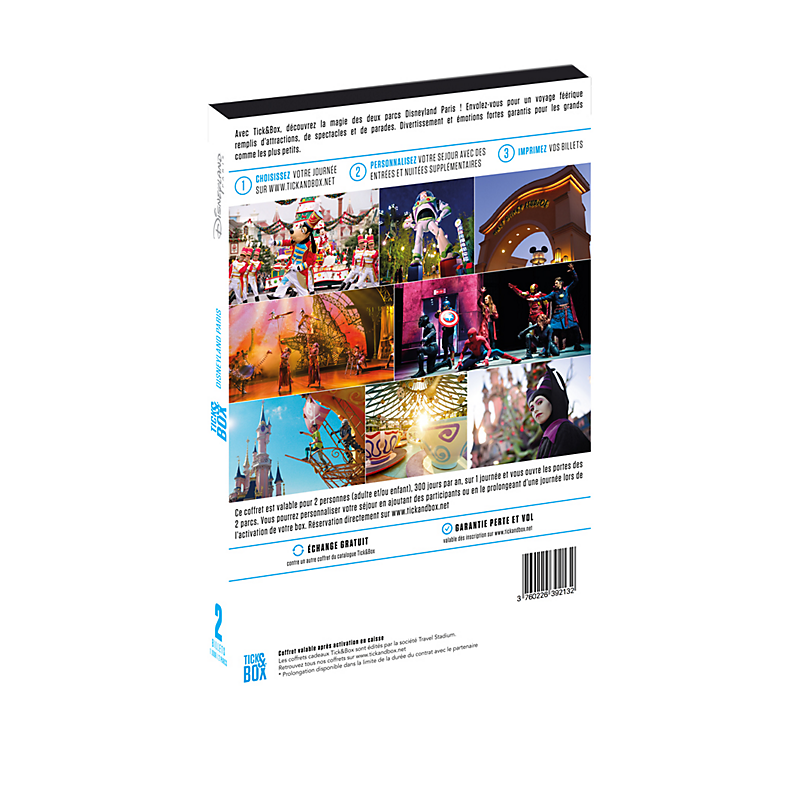 Avec Tickn'Box, découvrez la magie de Disneyland® Paris ! Retrouvez les histoires de votre enfance et celles d’aujourd’hui dans les 2 Parcs Disney®, avec plus de 50 attractions, des spectacles fascinants, des parades éblouissantes, des rencontres inoubliables avec les Personnages Disney® et des animations renouvelées au fil des saisons ! Avec Tickn'Box, plongez dans l'univers des plus beaux parcs à thèmes d'Europe. Dans votre Tickn'Box, vous découvrirez : Un chèque cadeau échangeable contre 2 entrées pour 1 journée/2 parcs valable 300 jours par an (période Mini et Magic). Ce chèque permet de réserver votre séjour en vous connectant sur le site tickandbox.net. Le coffret est valable pour 2 places, 24 mois à compter de sa date d’achat. Tickn'Box est revendeur officiel de Disneyland Paris. Choisissez votre journée et vivez une expérience unique. Votre séjour est totalement personnalisable lors de votre réservation en ligne (ajout d'entrées ou de journées supplémentaires au meilleur prix du moment).