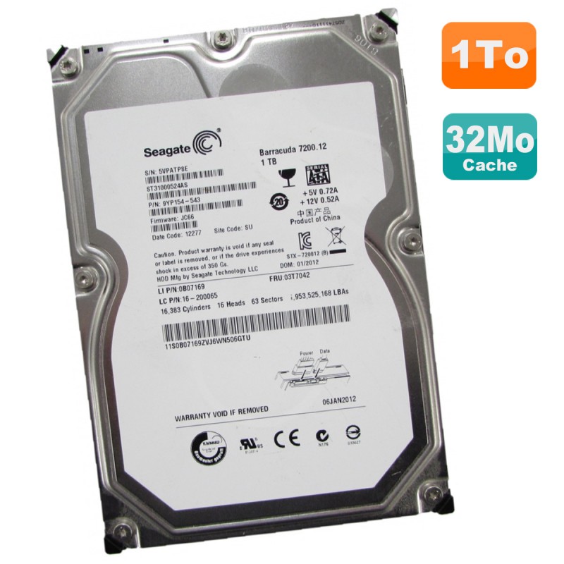 | Libellé | Disque Dur 1To SATA 3.5" Seagate Barracuda ST31000524AS Lenovo 0B07169 03T7042 |