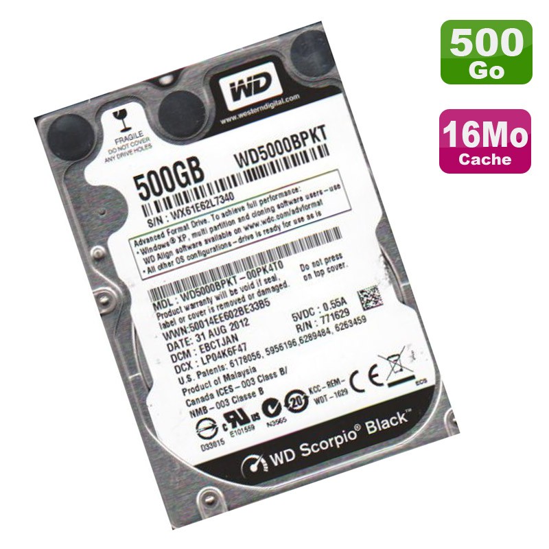 | Libellé | Disque Dur 500Go SATA 2.5" WD Black WD5000BPKT-00PK4T0 7200RPM Pc Portable 16Mo |