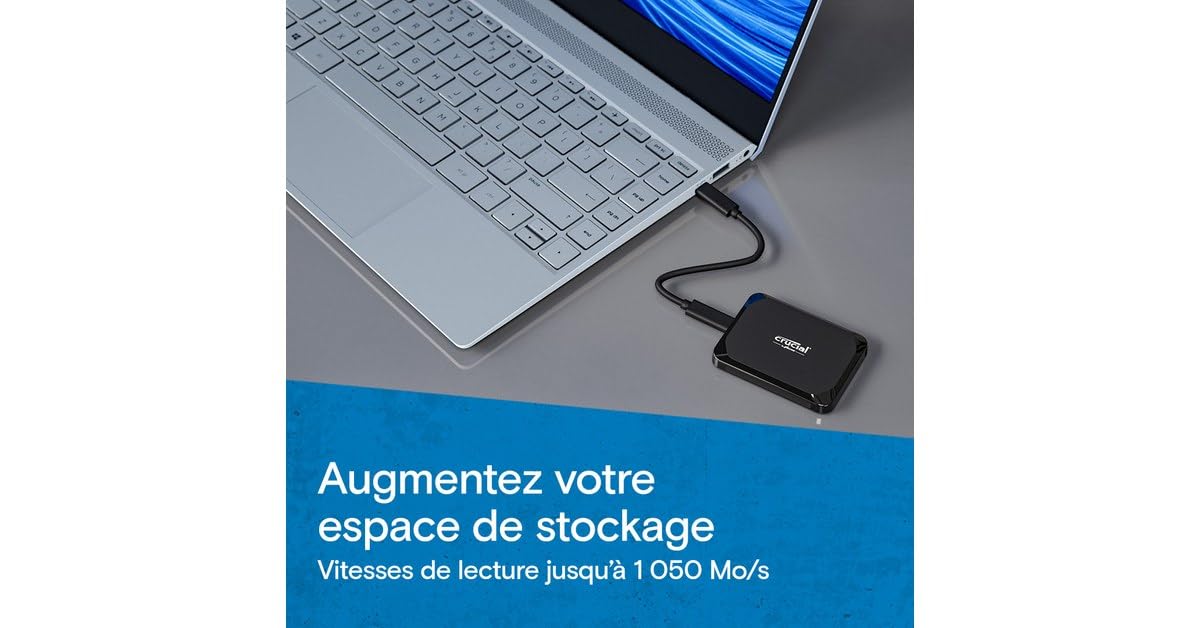 Sauvegardez tout ce qui compteSauvegardez vos fichiers, photos et vidéos préférésFonctionne avec l'historique des fichiers Windows, Apple Time Machine et Acronis True ImageImage SSD Crucial X9 avec appareils de jeuQualité fiable, conception pratiqueConception légère et durable de 65 × 50 mmTrou intégré pour cordon de transportVitesse en Mo/s telle que mesurée par Crucial comme le débit séquentiel maximal de l'appareil sur un PC de bureau hautes performances utilisant Crystal Disk Mark (version 8.0.4 pour x64). Les performances de votre ordinateur peuvent varier.Une partie de la capacité de stockage est utilisée pour le formatage et à d’autres fins et n’est pas disponible pour le stockage de données. 1 Go équivaut à 1 milliard d'octets.Comparaison des vitesses déclarées avec les vitesses maximales déclarées par les principaux fabricants de disques durs. Les performances de votre ordinateur peuvent varier.Jusqu'à 2,2 mètres sans perte de données sur une surface recouverte de moquette.La compatibilité peut varier et dépendre du format de l'appareil et des capacités de l'appareil sur lequel il est utilisé. Les appareils Android compatibles devraient pouvoir prendre en charge le stockage de masse USB via OTG. Le système d’exploitation peut avoir besoin d’être mis à jour et reformaté.Basé sur une taille de photo moyenne de 6 Mo, une vidéo H264 4K/60 ips à 24 Go/h et 200 Go pour les jeux AAA.De meilleures vitesses sont disponibles avec le câble USB Type-C vers C sur les appareils USB 3.2 Gen2 compatibles. Utilisez un adaptateur USB de type A pour les appareils plus anciens.Vendu au format exFAT. Il peut être reformaté en NTFS, APFS ou d'autres formats. Le reformatage entraînera une perte de données sur le lecteur.Spécifications :-Facteur de forme SSD : externe-SDD, capacité : 2 To-Interface : USB 3.2 Gen-2 (10 Gb/s)-Composant pour : PC/Ordinateur portable-Séquence de lecture : 1050