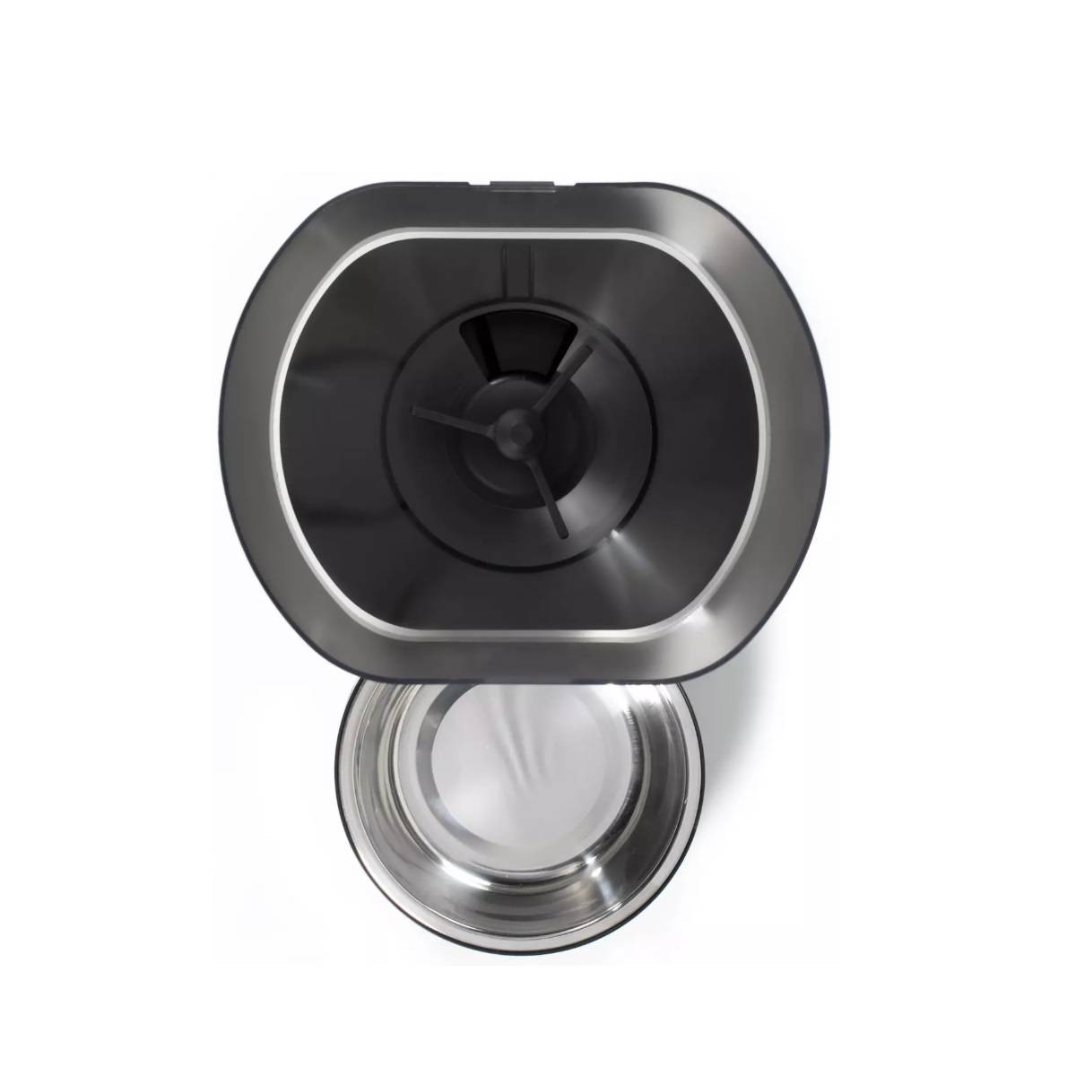 Equipement : Bol inox et réservoir amovibles, Pale en silicone intégrée (évite que la nourriture reste bloquée).