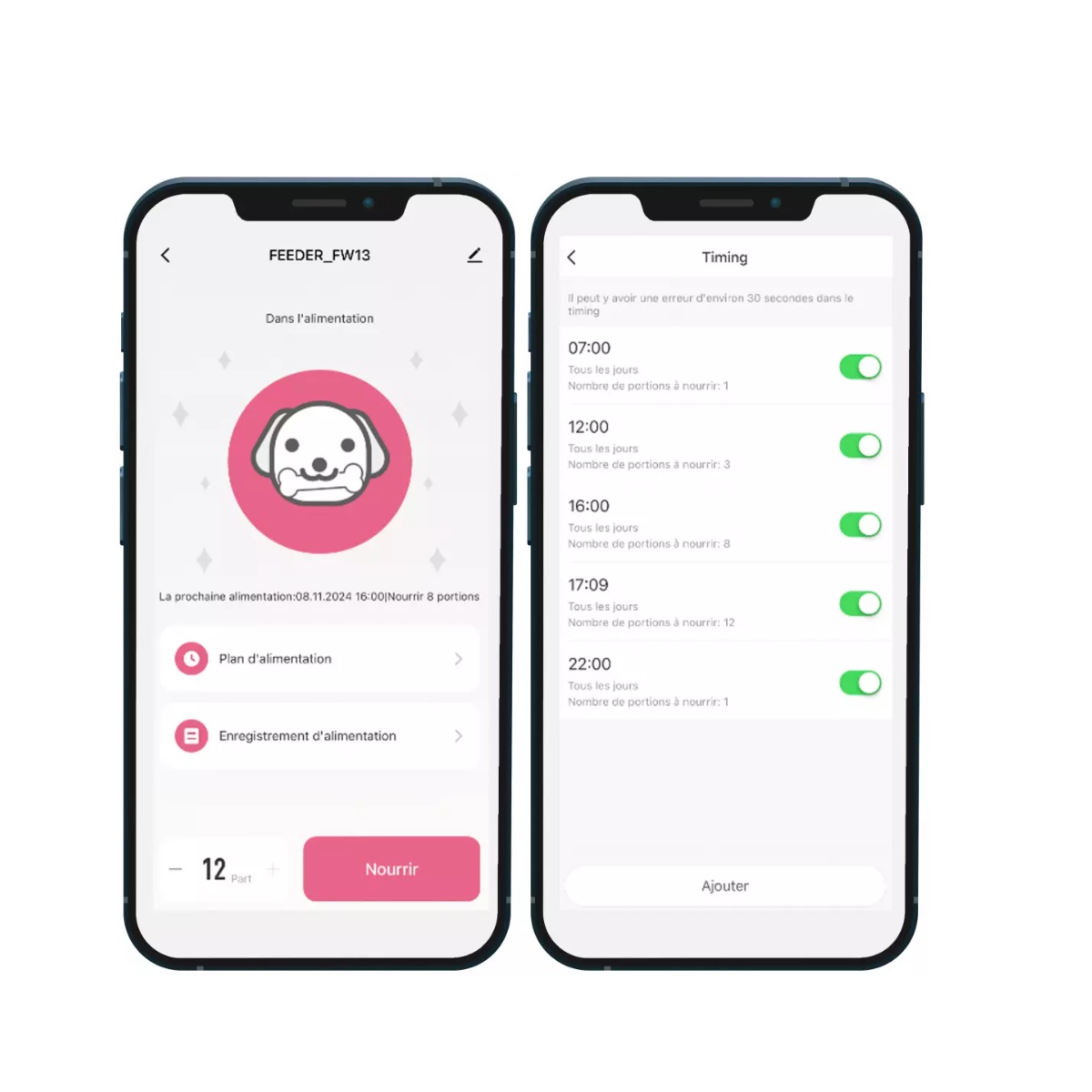 Type de programmes(s) : Horaires et quantités programmables avec journal de bord jusqu'à 10 repas par jour / 12 portions par repas (8 à 12 g par portion).