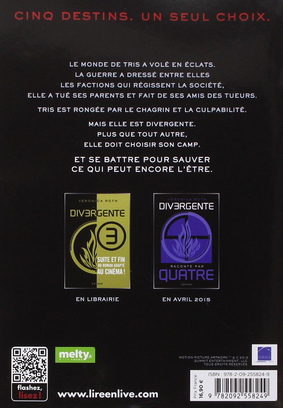 Abandonnant une ville à feu et à sang, Tris est en fuite. Grâce à ses facultés de Divergente, elle a réussi à échapper au programme des Érudits qui a manipulé et lancé les soldats Audacieux à l'assaut des Altruistes. En trois jours, Tris a perdu sa faction, ses amis, ses parents. Pourtant, elle n'a pas le droit de baisser les bras. Elle seule peut se dresser face aux Érudits. Les combats ont repris, et le temps presse....