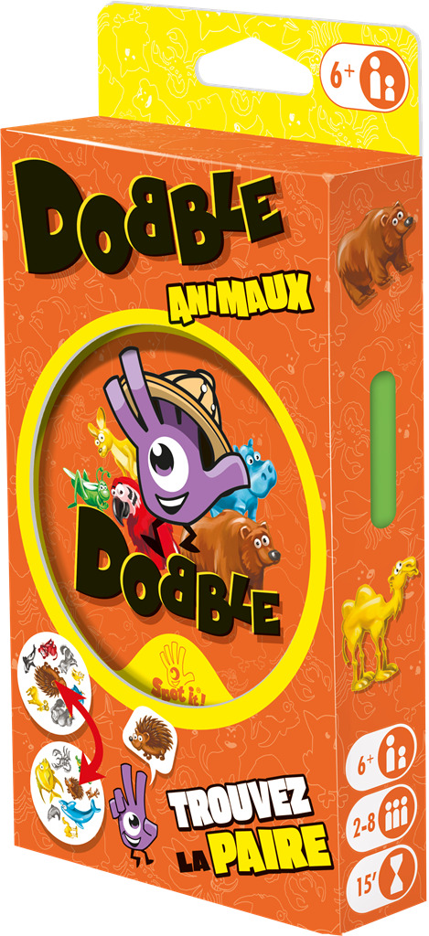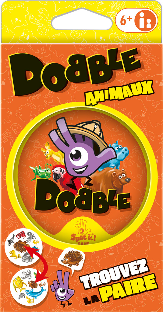 Dobble s’invite chez les animaux ! Repérez plus vite que les autres l’animal en commun entre deux cartes ! Observation, rapidité et fun garantis !