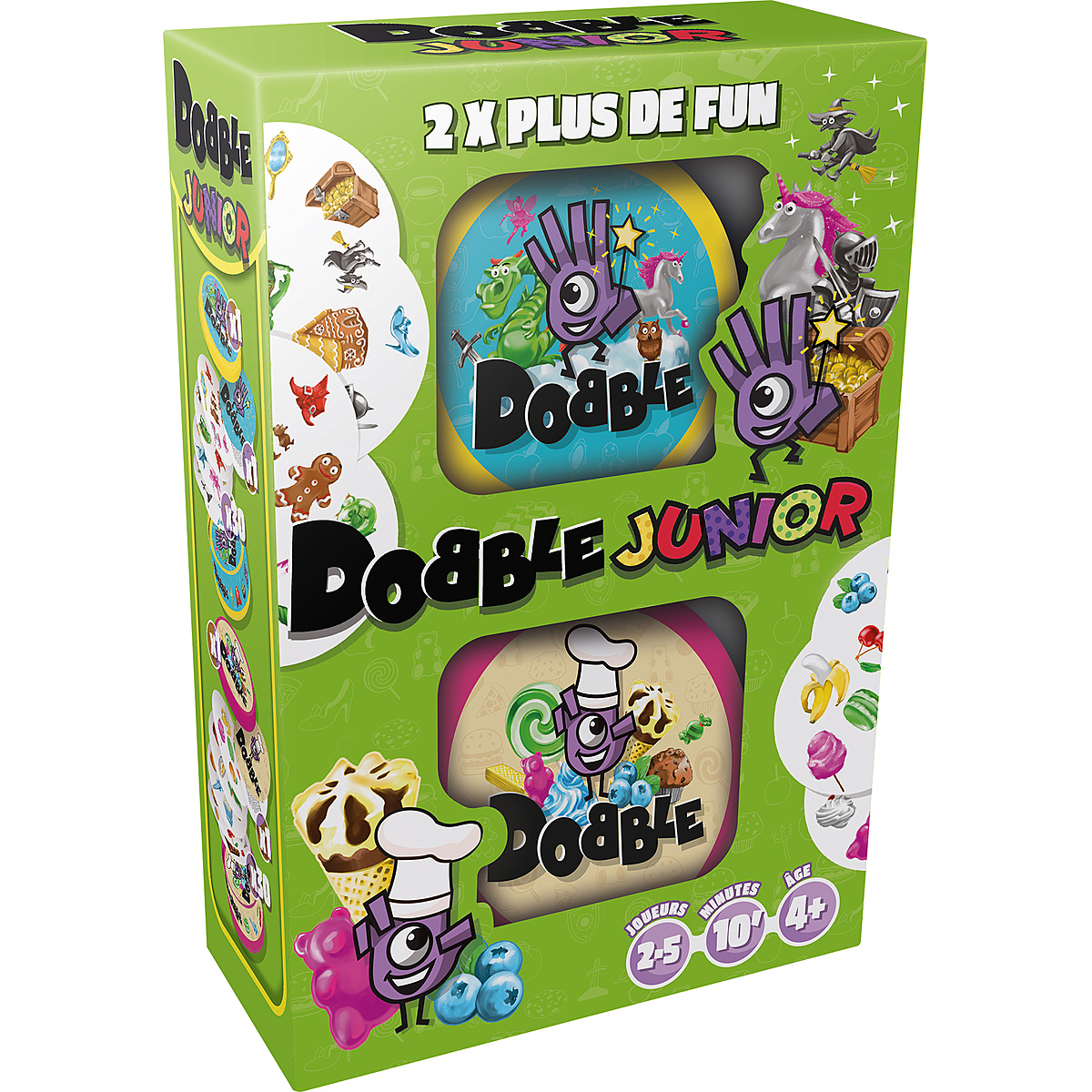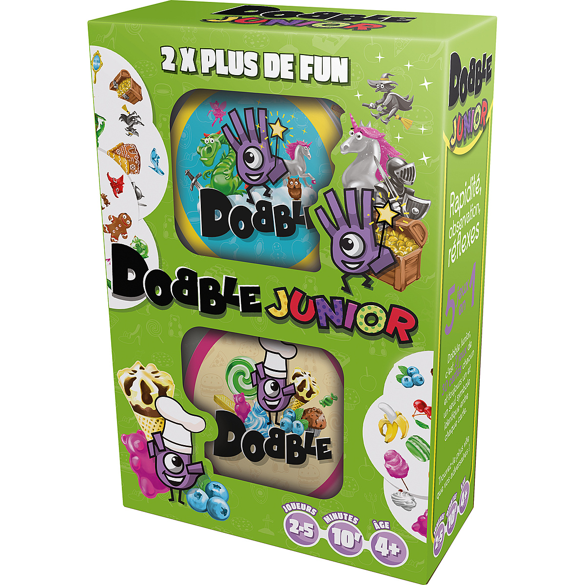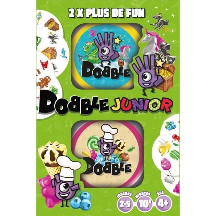 Dobble Junior rassemble deux boites de jeu, soit 2 fois plus de fun quune boite classique ! Y sont inclus deux nouveautes completes : un Dobble Food et un Dobble Fantasia. Ainsi les petits gourmands qui revent de gateaux, de glaces et de bonbon peuvent se regaler en jouant ! Et Dobble Fantasia dont le monde enchante et feerique aidera les enfants a developper leur imaginaire, deviendra un indispensable pour revivre les plus grands contes : la maison en pain depice, les licornes, fees et autres bottes de 7 lieues.