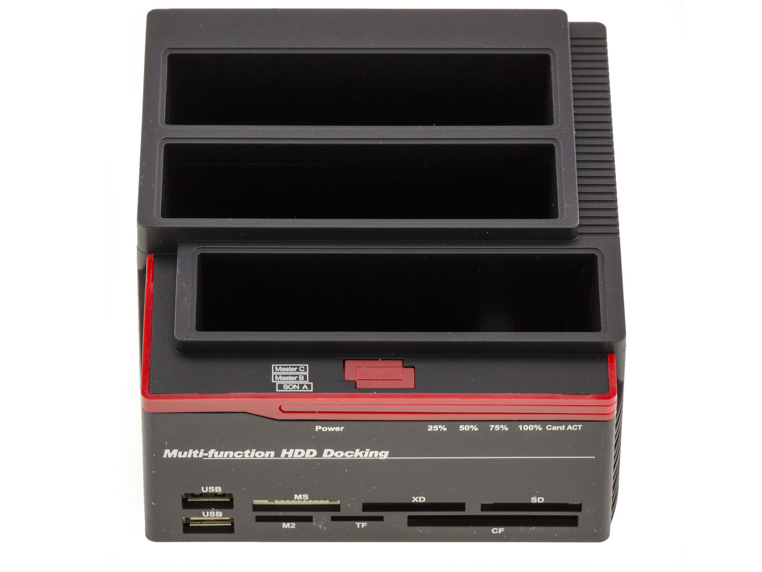 DOCKING STATION IDE + SATA Utilisation : Ce boitier, relié en permanence à un port USB du PC va vous permettre d'utiliser à loisir des disques durs internes IDE 2.5 ou 3.5 et SATA 2.5 ou 3.5 comme de simples clés USB !. Compatibilité : Compatible USB 3.0 USB 2.0 et USB 1.1, vitesse maximale de l'USB 3.0. Fonctionne pour les disques durs SATA 2'1/2 et 3'1/2 SATA I OU II, et les disques durs IDE 3.5"" et 2.5"" ( = pour PC de bureau ou portable). COMPATIBILITE IDE : Notez que nous déconseillons l'usage de cette station avec des disques IDE de marque Western Digital. Compatible SATA 1/2/3. Compatible TOUS WINDOWS (2000, XP, Vista, Seven, 8, 10 etc...) et MAC depuis OS X !!. Caractéristiques : FACE AVANT : HUB USB (USB 2.0) 2 ports / Lecteur de cartes SD, XD, MicroSD (TF), MS, M2 et CF / Diodes d'alimentation. FACE ARRIERE : Bouton Marche/arrêt / Prise pour l'alimentation electrique externe (fournie) / Prise pour liaison USB3 (cordon fourni). FACE SUPERIEURE : 3 emplacements pour disques durs : Disque A (avant) : SATA 2.5 ou 3.5 / Disque B (centre) : SATA 2.5 ou 3.5 / Disque C (arrière) : IDE 2.5 ou 3.5. FONCTION CLONAGE : Possibilité de cloner hors ligne (non relié au PC) 2 disques : le disque A sera la source, et la copie sera soit le disque B, soit le disque C. Le clonage se fait sans logiciel, par simple appuis sur le bouton en façade.