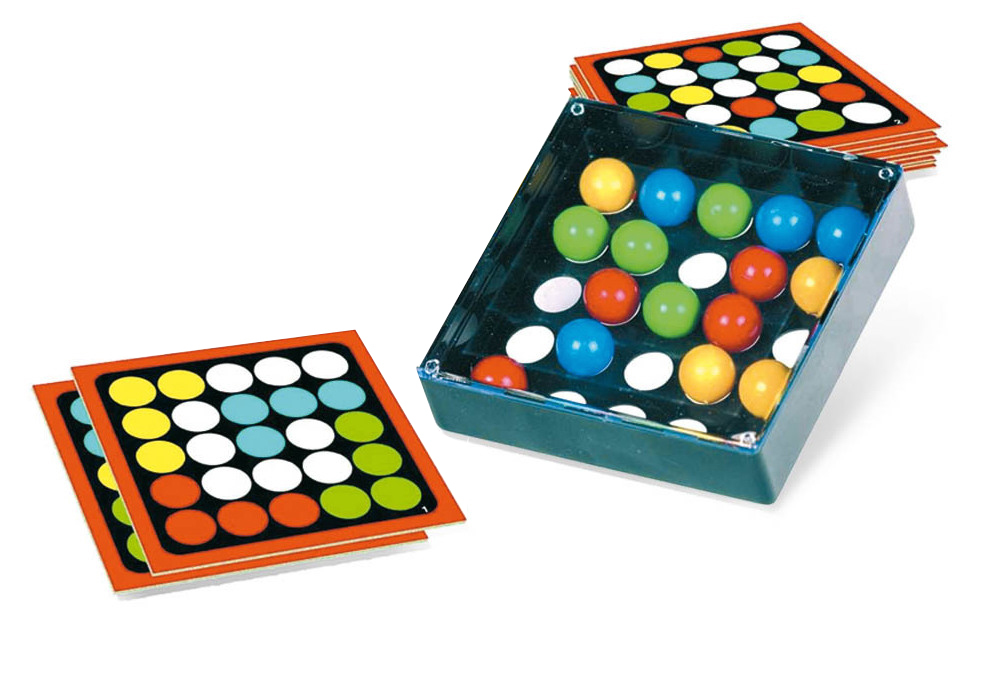 Un jeu d’observation, de logique et de dextérité qui consiste à reproduire le motif indiqué sur les cartes le plus rapidement possible! En faisant glisser les boules par dessous avec les doigts, il faut recopier le modèle d'une carte, seul ou à deux, le plus vite possible et sans erreur. Il est possible d’utiliser les cartes fournies ou de les retourner pour colorer les ronds blancs et ainsi créer ses propres cartes.