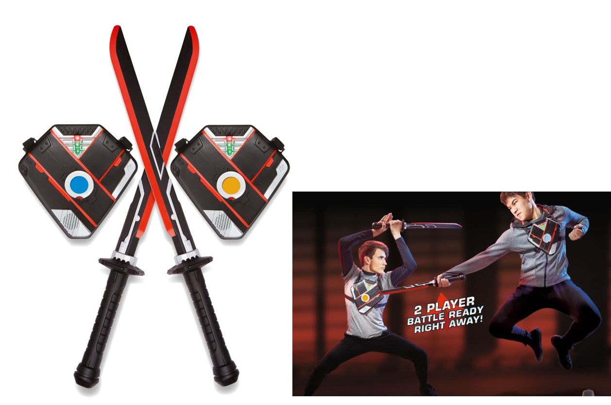Passe ton sabre devant le capteur de ton adversaire ou touche son plastron pour lui prendre une vie ! Si tu réussis, une des lumières de ton plastron changera de couleur et un son retentira ! Inclus 2 sabres, 2 plastrons avec capteurs et 2 disques de couleur. 2 modes de jeu. 6 piles LR03/AAA non incluses. Dès 6 ans.