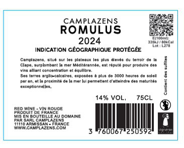 Libellé Domaine Camplazens Romulus, 2024 - Coteaux de Narbonne IGP - Rouge - 75 cl