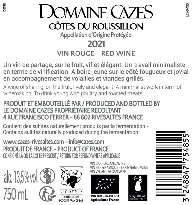 | Libellé | Domaine Cazes BIO, 2021 - Côtes-du-Roussillon AOP - Rouge - 75 cl |