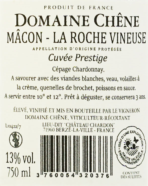 | Libellé | Domaine Chêne Prestige , 2023 - Mâcon-La Roche-Vineuse AOP - Blanc Sec - 75 cl |