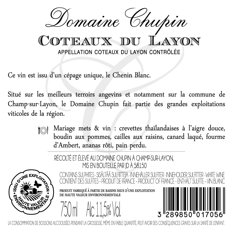 | Libellé | Domaine chupin, 2022 - Coteaux du Layon AOP - Blanc Moelleux - 75 cl |