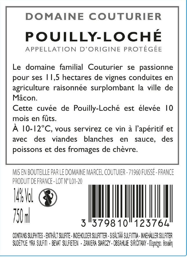 | Libellé | Domaine Couturier, 2020 - Pouilly-Loché AOP Sec - Blanc - 75 cl |