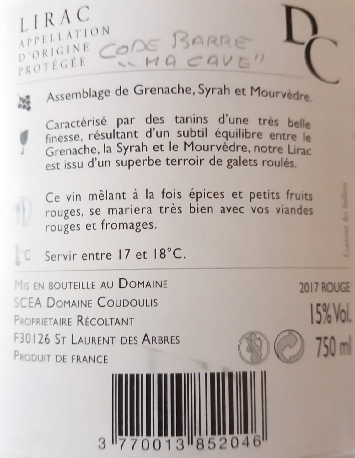 | Libellé | Domaine de Coudoulis, 2020 - Lirac AOP - Rouge - 75 cl |
