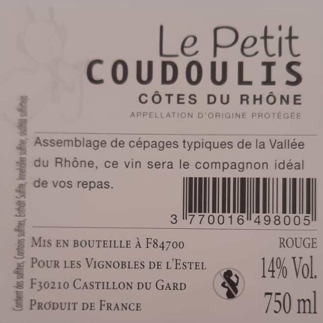 | Libellé | Domaine de Coudoulis - Le Petit Coudoulis, 2022 - Côtes du Rhône AOP - Rouge - 75 cl |