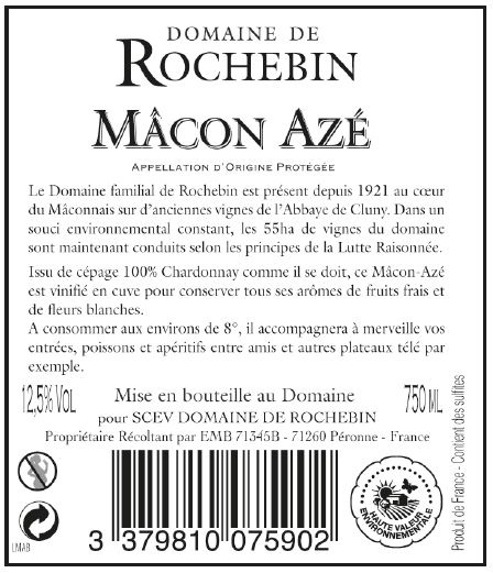 | Libellé | Domaine de Rochebin, 2023 - Mâcon-Azé AOP - Blanc Sec - 75 cl |