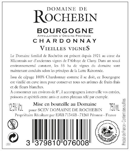 | Libellé | Domaine de Rochebin Vieilles Vignes, 2021 - Bourgogne Chardonnay AOP - Blanc Sec - 75 cl |