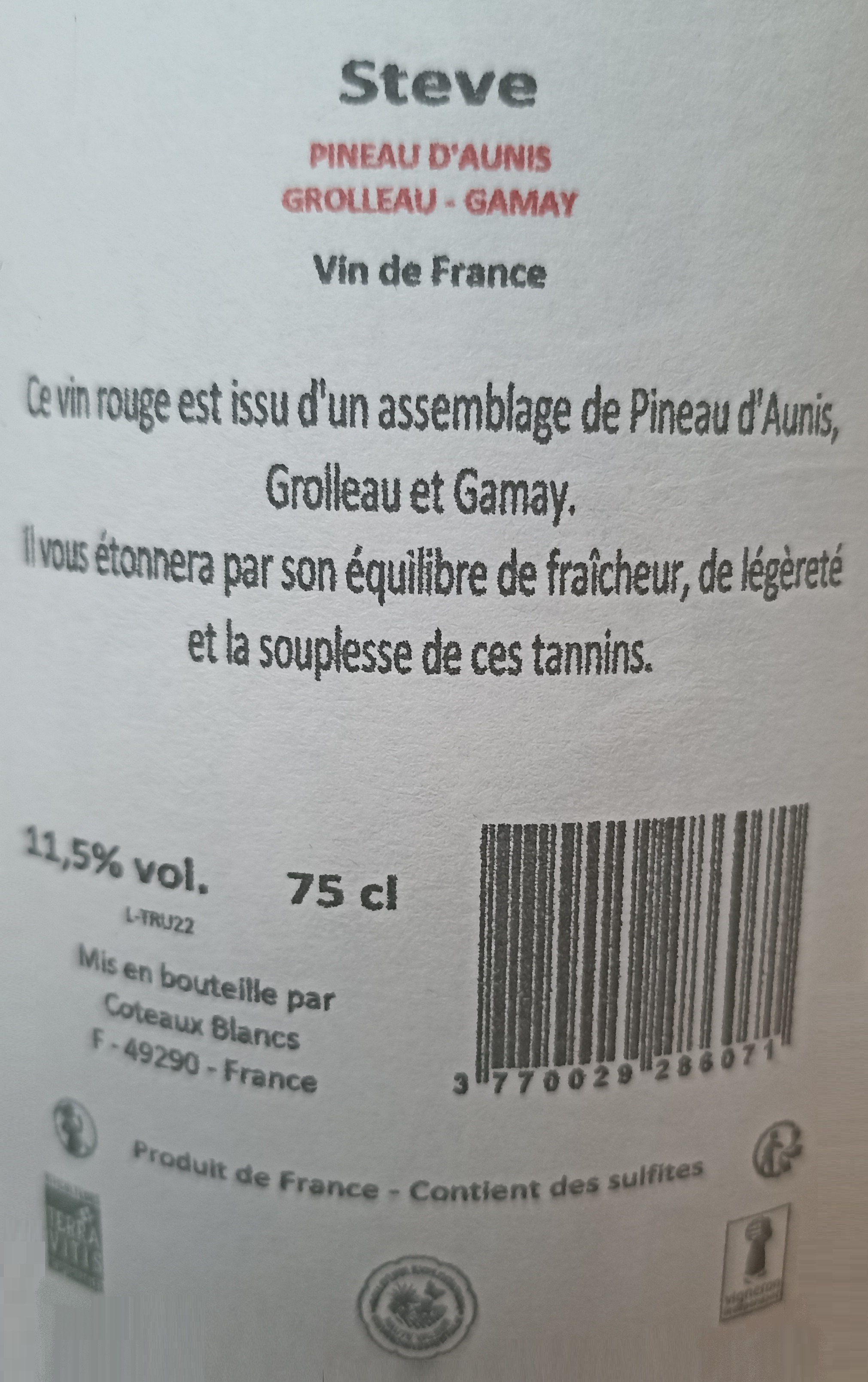 | Libellé | Domaine des Coteaux blancs, Steve l'Intrépide - Vin de France - Rouge - 75 cl |
