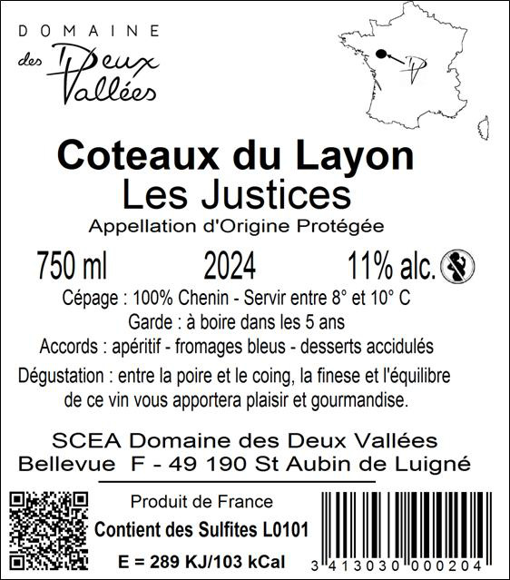Libellé Domaine des Deux Vallées Les Justices, 2024 - Coteaux du Layon AOP - Blanc Moelleux - 75 cl