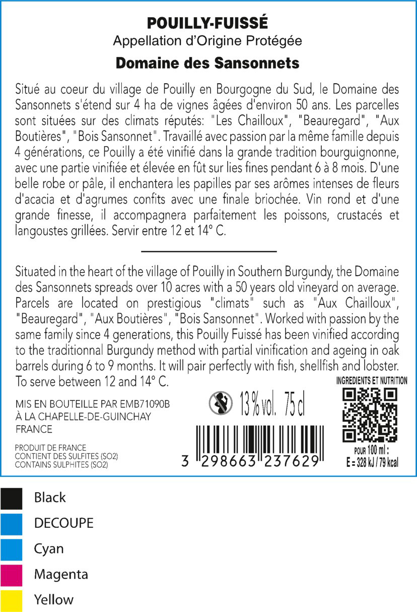 | Libellé | Domaine des sansonnets, 2024 - Pouilly-Fuissé AOP - Blanc Sec - 75 cl |