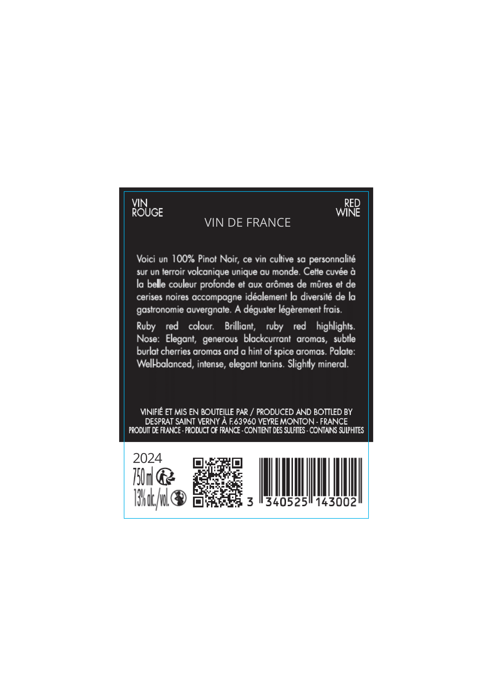 | Libellé | Domaine Desprat Saint Verny Vignoble Volcanique "Le Pinot Noir", 2024 - Vin de France - Rouge - 75 cl |