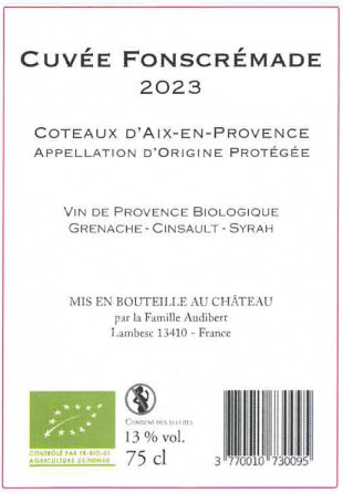 | Libellé | Domaine Fonscremade "Famille Audibert" BIO, 2023 - Coteaux d'Aix en Provence AOP - Rosé - 75 cl |