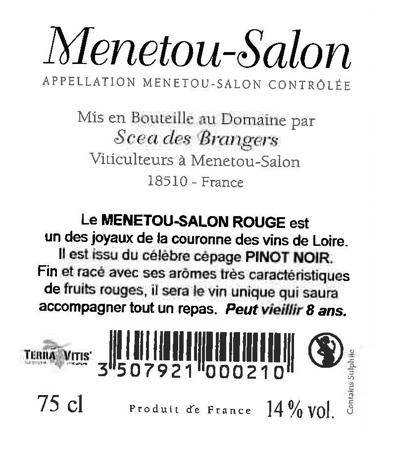 | Libellé | Domaine Gaec des Brangers, 2023 - Menetou-Salon AOP - Rouge - 75 cl |