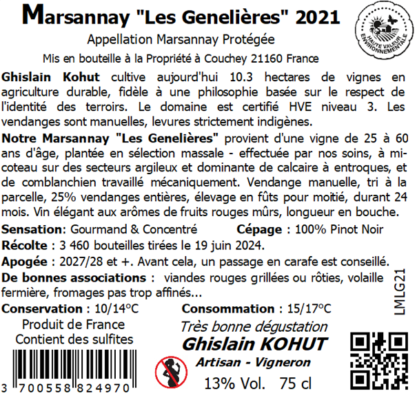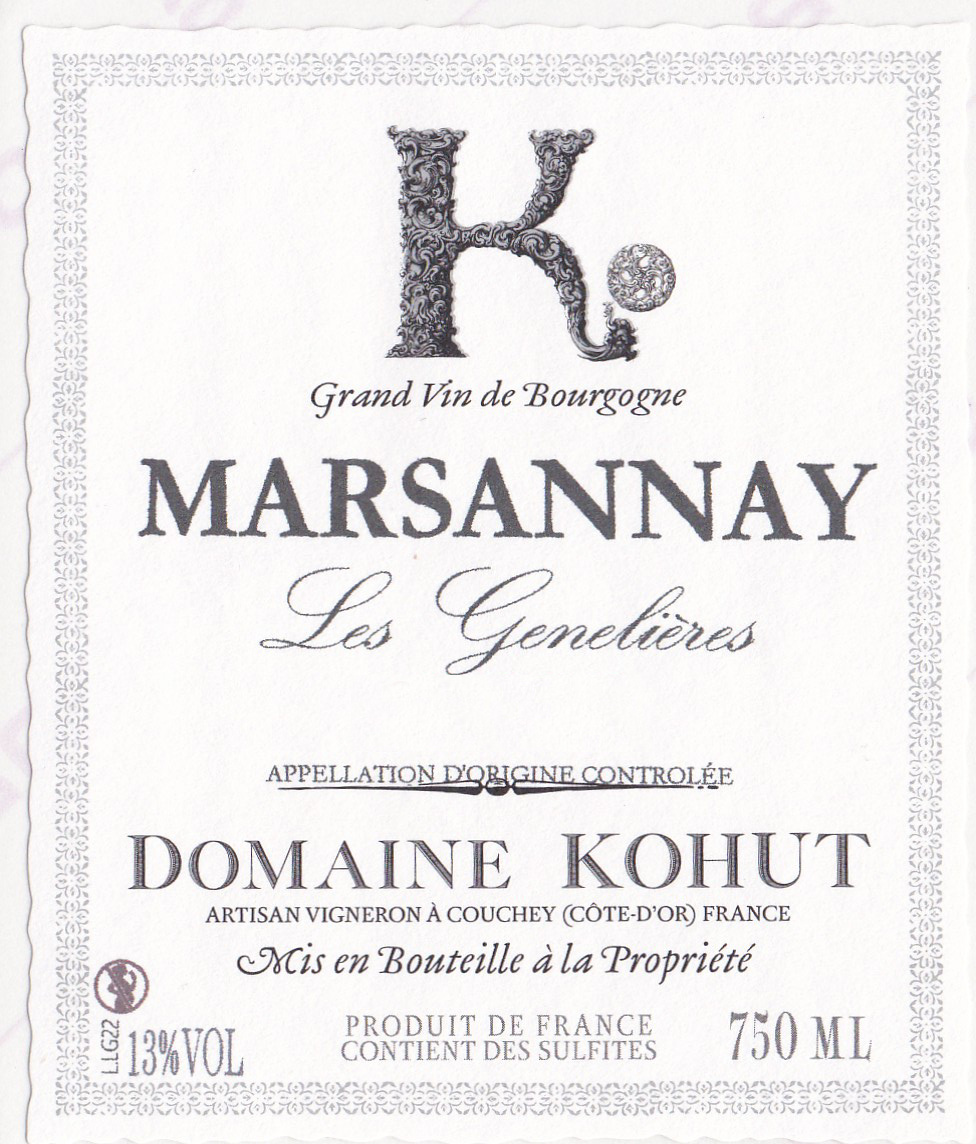 | Libellé | Domaine Kohut Les Genelières, 2021 - Marsannay AOP - Rouge - 75 cl |