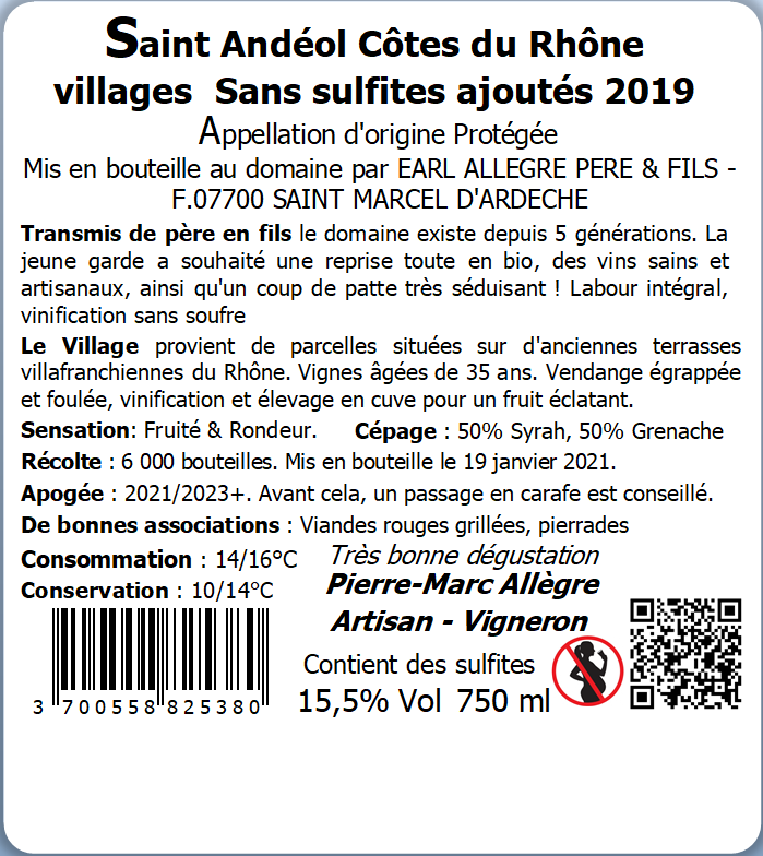 Spécificités de production Ce Côte du Rhône provient de parcelles situées sur d'anciennes terrasses villafranchiennes du Rhône. Les vignes sont âgées de 35 ans. Vendange égrappée et foulée.